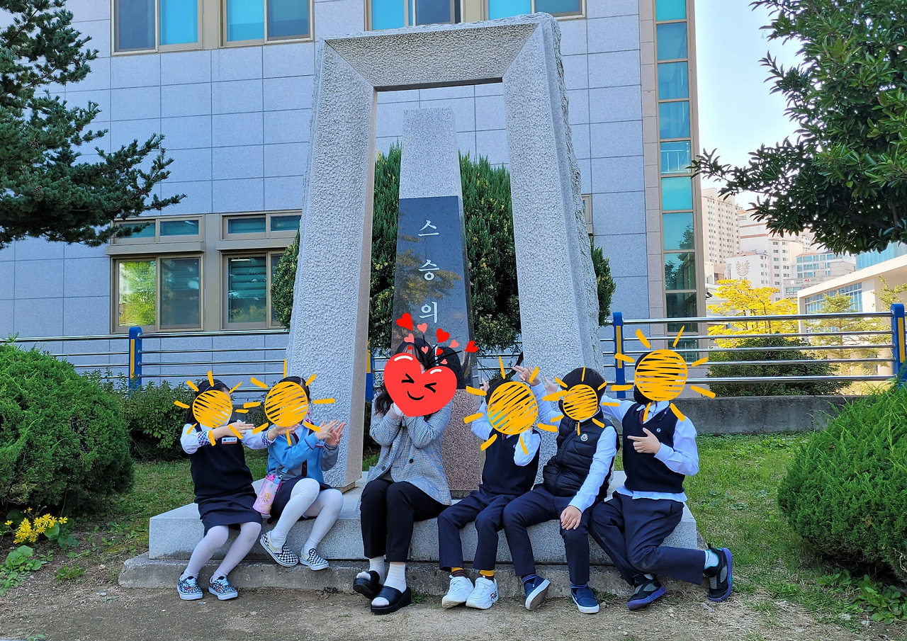 아이들과 교생 선생님이 <스승의 길> 앞에 함께 앉아서 사진을 찍었다.