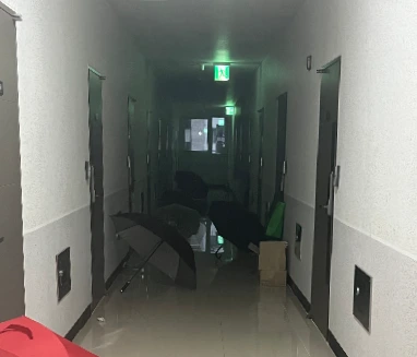 좁은 복도를 두고 물방울을 잔뜩 머금은 우산들 덕에 복도는 버섯동산이 된다.