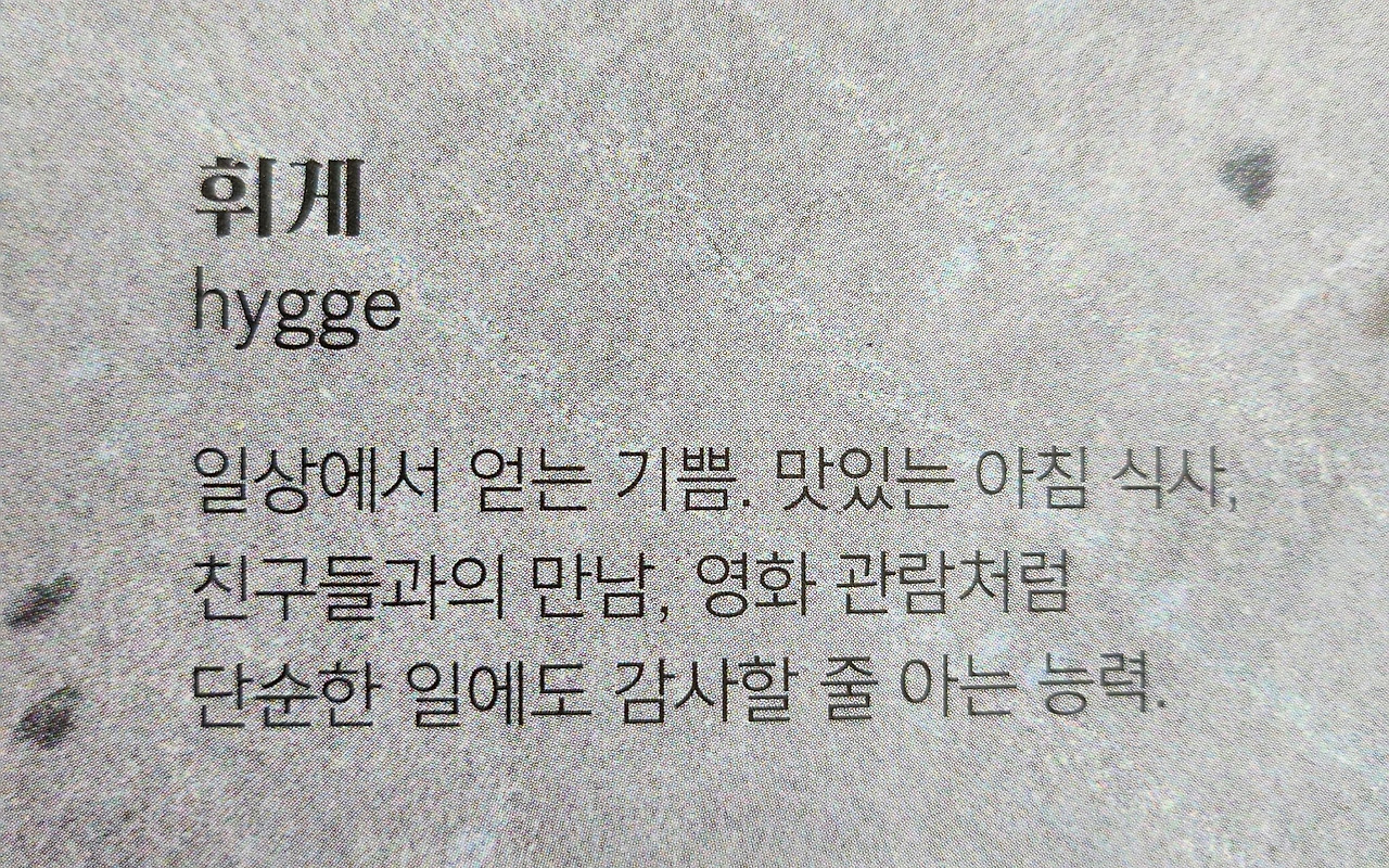 이 책에서 내가 유일하게 아는 단어. 휘게. 단순한 일에도 감사할 줄 아는 능력을 갖는다면 삶이 조금 수월해질지도 모르겠다.