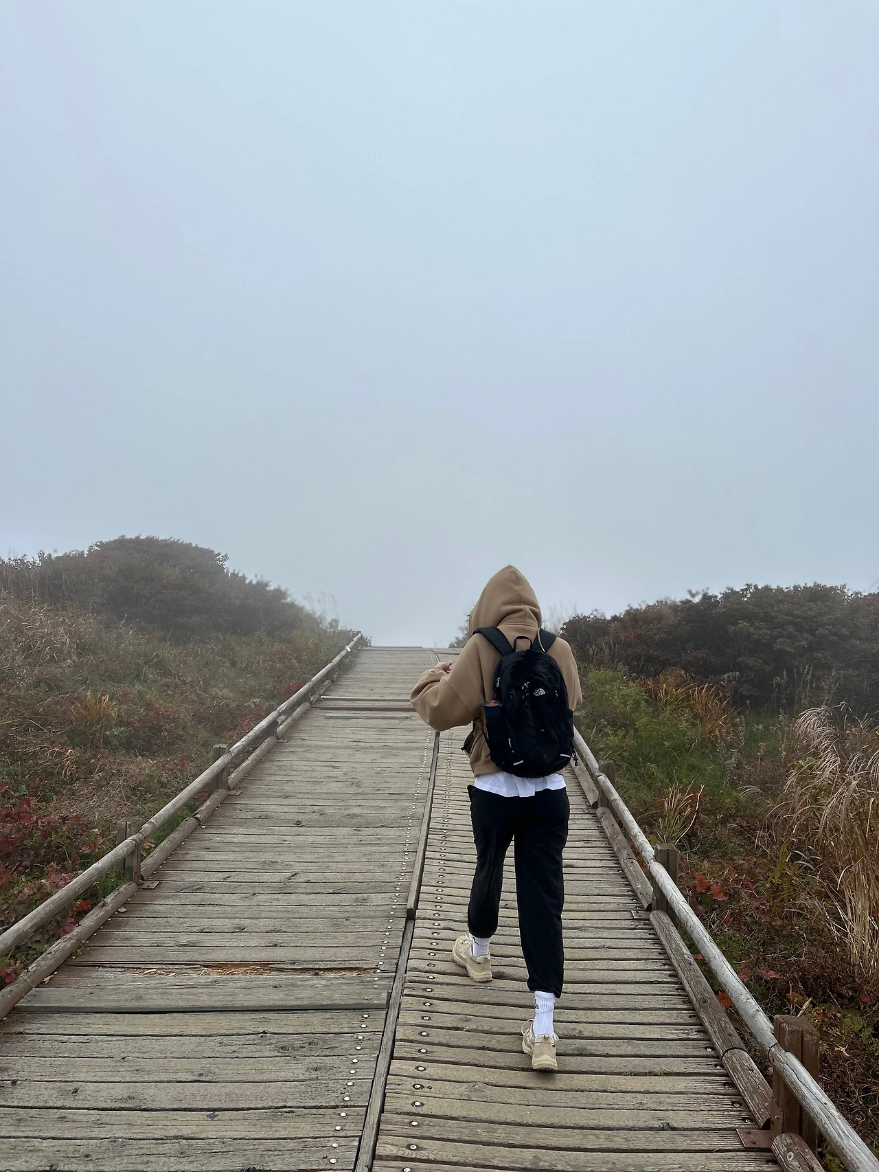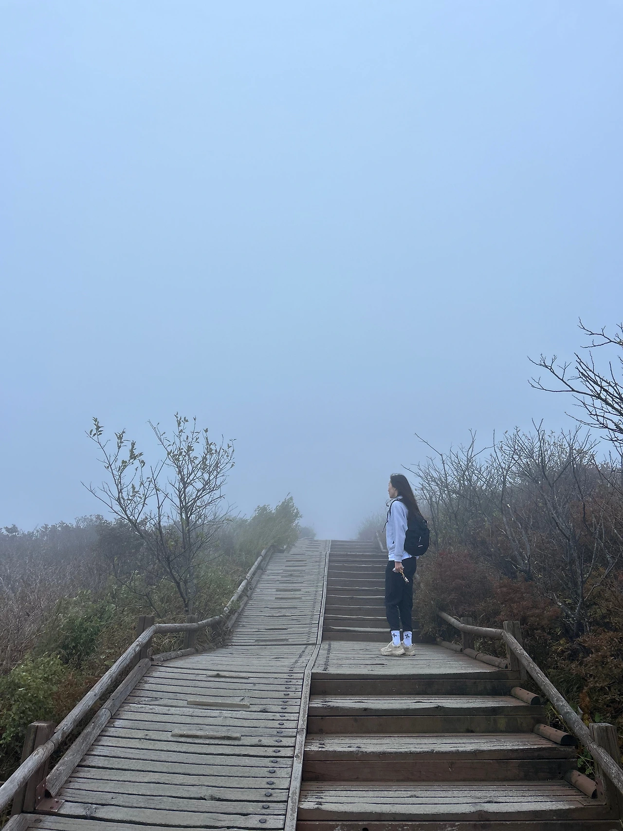산에는 단풍을 시작되고 있었다. 우리는 지리산의 정기를 받아가자며 심호흡을 하며 씩씩하게 걸음을 디뎠다. 중간고개에 다다르자 미리 산행을 예약할 때 받은 QR코드를 제시하고 입장하는 게이트가 나왔다. 이제 진짜 노고단으로 가는 거야. 설레는 마음과 달리 날씨는 잔뜩 흐렸다. 군데군데 산안개가 짙게 껴서 한 치 앞도 안 보이는 구간들이 있었다. 안개인지 구름인지 모를 것들이 바람에 실려왔다가기를 반복했다. 해발 1500m. 세찬 바람에 머리카락이 일정치 않은 방향으로 마구 날렸다. 춥고 손 시리고 콧물이 나왔다. 정상에 도착한 우리는 추위에 못 이겨 대충 사진을 찍고 급히 하산했다.