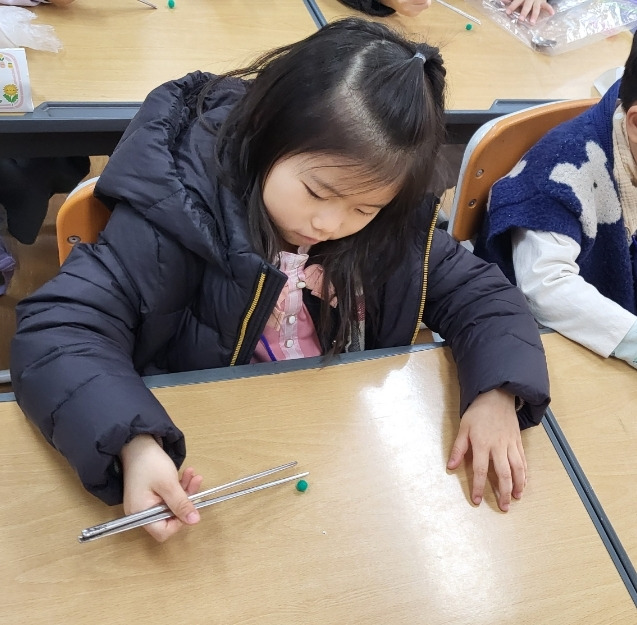 -오늘은 젓가락으로 폼폼이 옮기는 연습 했어.