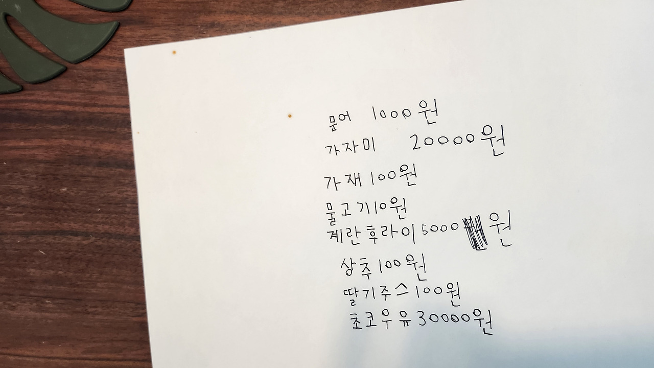 식당 놀이를 위해 만든 귀염둥이의 메뉴판