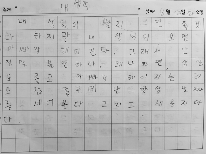 생일이 빨리 왔으면 좋겠는데 생일이 되면 곧 아빠와 헤어져야 하니 생일이 안 왔으면 좋겠다는 양가적 마음. 아빠가 너무너무 좋은 담은 아빠를 두고 돌아갈 생각을 하니 불안한가 보다. 헤어지는 날에 또 얼마나 울지 벌써 걱정이다.