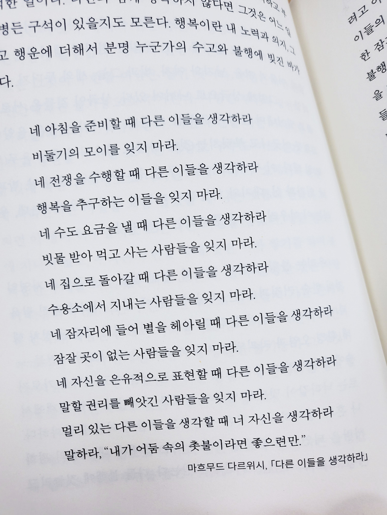 혼자만 불행을 회피하려고 전전긍긍하고, 혼자만 행복해지려고 아등바등 고투하는 것은 비루한 짓이다. 먼 곳에서 사는 이들의 고난과 고통을 품고 함께 아파해야 한다. 우리의 안락한 잠과 따뜻한 밥은 누군가 노동하고 수고한 대가다. 누군가 불행에 빠져 허덕인다면 우리는 그 책임의 일부를 나눠질 생각을 가져야 한다. 불의와 폭력에 눌리고 신음하는 사람들, 난민들과 이주 노동자들과 노숙자들이 겪는 고통과 불행에 대한 연민과 공감이 있어야만 한다. 마흐무드 다르위시라는 시인은 우리에게 “다른 이들을 생각하라”라고 말한다. 우리가 아침밥을 먹을 때 휑한 눈으로 굶주린 채 망연자실한 사람들, 우리가 아늑한 침대에 누워 잠을 청할 때 창공의 별을 보며 가야 할 방향을 가늠하는 여행자들과 집 없이 차가운 지하도 바닥에 골판지를 깔고 잠드는 사람들을 기억해야 한다. 저 혼자 잘 먹고 잘 사는 행복은 죄악일 뿐이다.