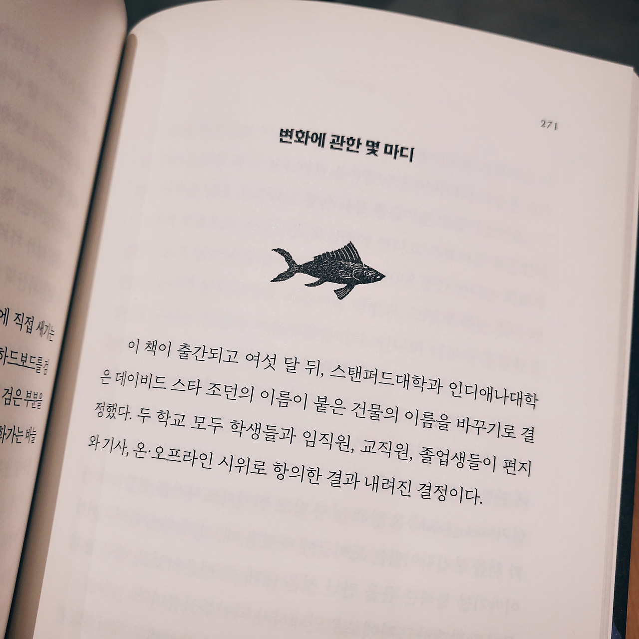 이야기는 데이비드 스타 조던이라는 과학자의 생애로 시작하여 그의 업적과 함께 전개된다. 절반 정도까지는. 그 이후는 반전이다.
