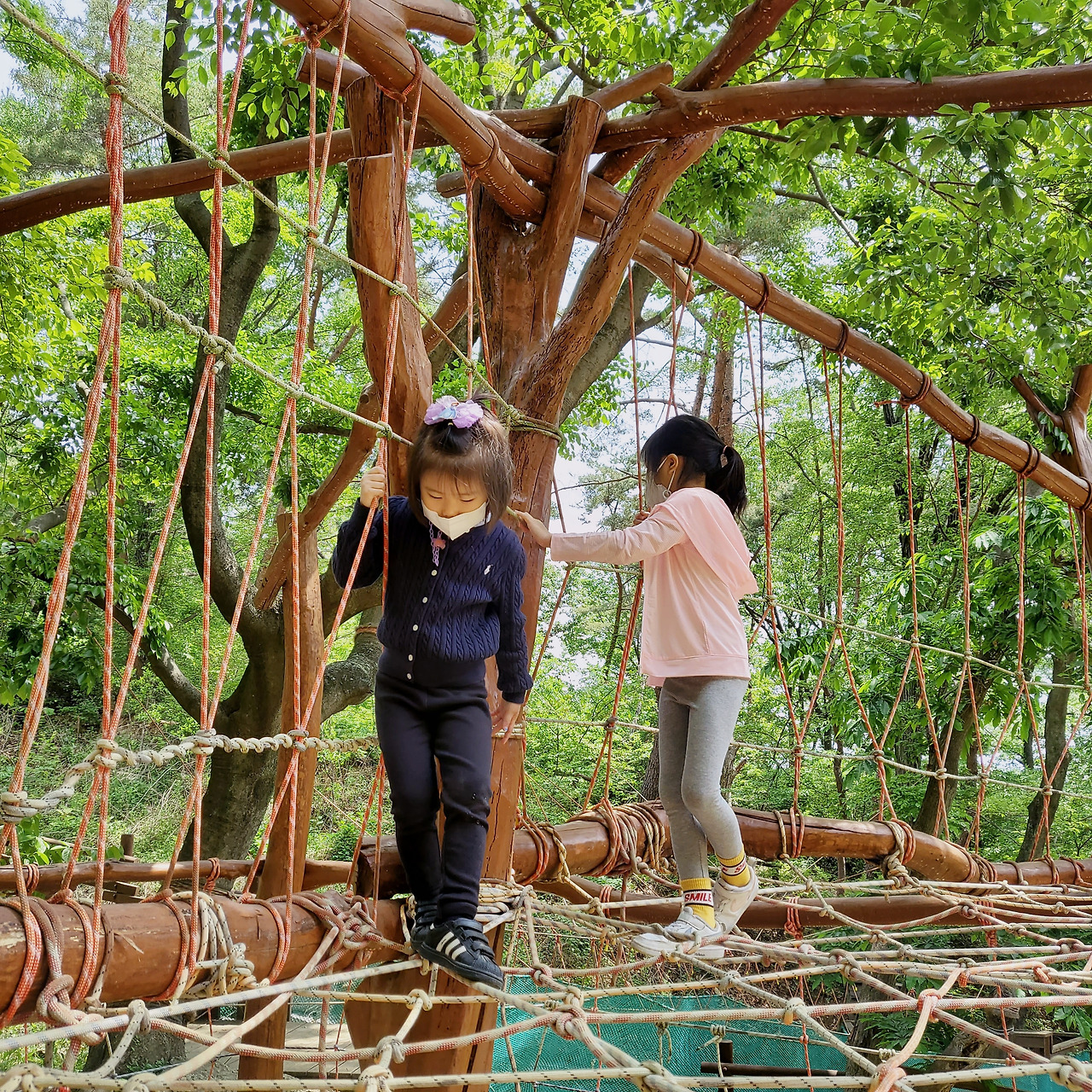 숲 놀이터에서 아이들은 한바탕 신나게 놀았다. 로프로 엮어 만든 정글짐을 오르내리고 흔들거리는 출렁다리를 왔다 갔다 했다. "엄마 여기 봐! 나 여기까지 올라왔어!" 하며 연신 소리치고 까르르거린다. 먹는 일에 관심이 낮아서 체형이 퍽 마른 편인데도 두 여자아이는 신체활동에 과감하고 자신감이 높은 편이다. 눈앞에 나타난 것에 오롯이 몰입하여 감탄하고 만끽하는 아이들의 천진함은 숲에서도 빛을 발했다.