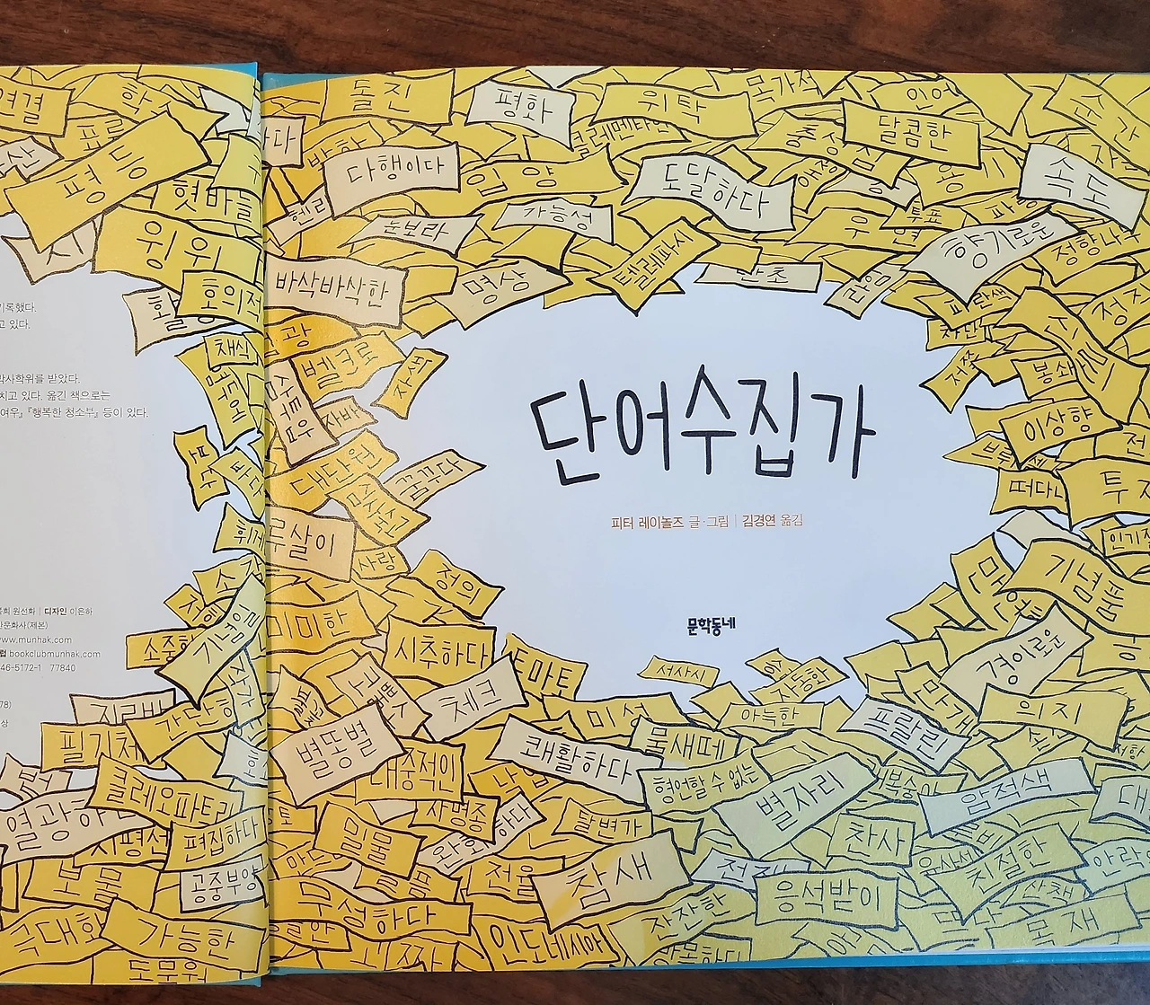 책은 새로운 단어를 발견할 때마다 그것을 수집하는 주인공에 관한 이야기이다. 내 딸들은 첫 페이지에 나오는 이 수많은 단어카드 중에 본인이 아는 글자를 찾는 일을 몹시 좋아한다. 7세인 첫째는 이제 대부분 읽을 수 있지만, 6세에게는 아직 도전적이다.