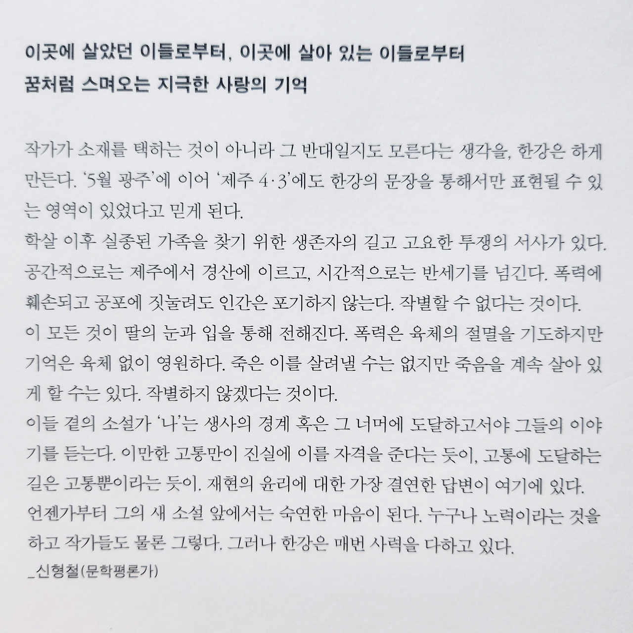 소설은 온통 눈이다. 성근 눈이 내리는 화자의 꿈으로 시작하여, 한라산의 중턱의 폭설, 그리고 70년 전 제주의 어느 학교 운동장에 스러진 수백 명의 얼굴에 쌓이던 눈까지. 이유 없이 죽어야 했던 삼만 명의 사람들과, 적의 편으로 낙인찍힐까 유해를 수습하지도 못한 유족들. 그 침묵의 절규는 하염없이 쏟아지는 함박눈에 묻혔다. 눈 결정 속의 텅 빈 공간이 소리의 잔향을 빨아들임으로써 실제로 주변을 고요하게 만드는 것처럼.