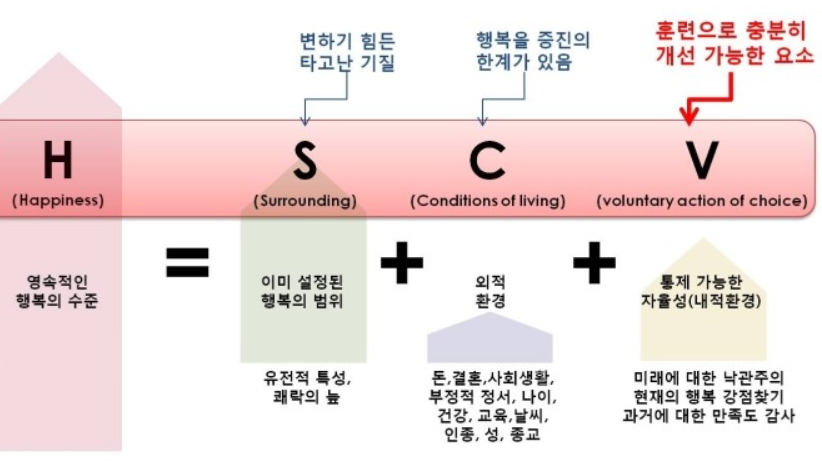 해석해보면, 우리가 느끼는 행복감의 반은 유전적 기질로 좌우된다. 낙천적인 성격을 갖고 태어난 사람이 운명적으로 행복할 가능성이 높다. 행복해지기 위해 고군분투하는 요소가 외부환경(C)인데, 영향은 미미하다. 돈을 많이 벌거나 뭔가를 성취해서 느끼는 행복의 효용이 오래가지 못하는 이유가 여기에 있다. 마지막 남은 40%의 변수가 희망을 준다. 마음먹기에 따라서 통제가 가능해 엘도라도의 꿈을 실현할 수 있다.