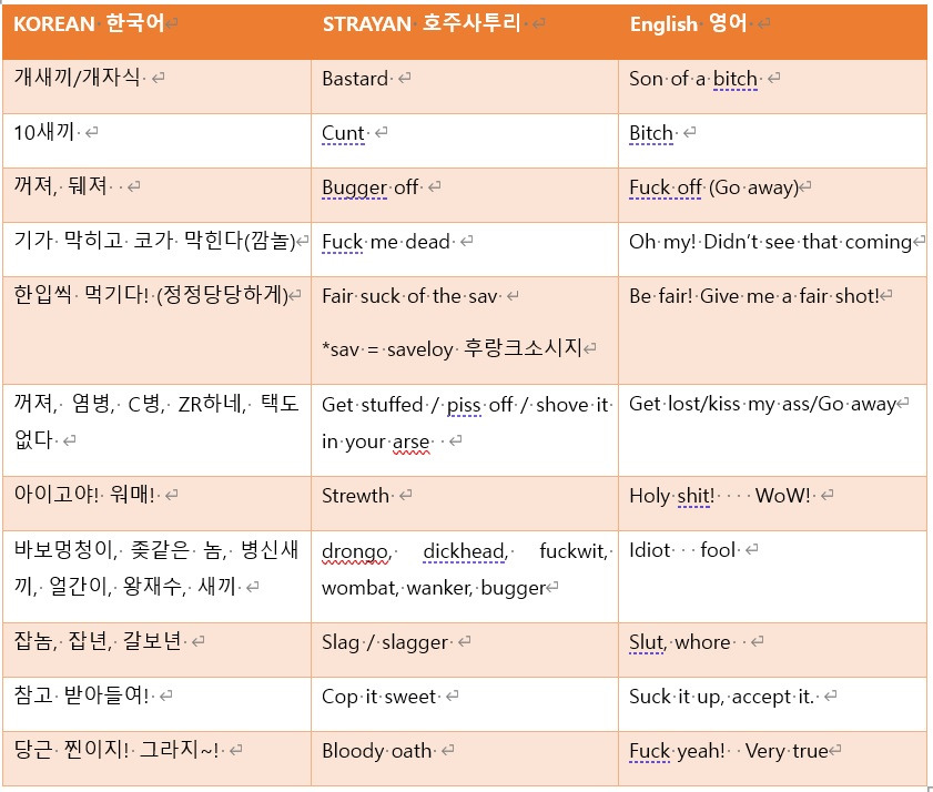 마지막으로 표에 정리한 단어들 외에 매일같이 호주 사람들이 입에 붙어 잘 쓰는 Top 3 욕이 있다. 꼭 알아두고 사용하자.