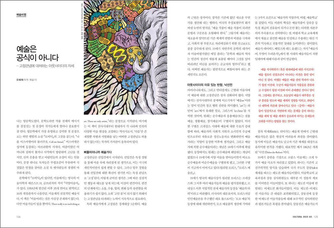 월간 문화 전문지인 『쿨투라』의 2023년 2월호에 제 예술비평글 “예술은 공식이 아니다: 고정관념에 대처하는 아웃사이더의 자세”가 실렸습니다.
