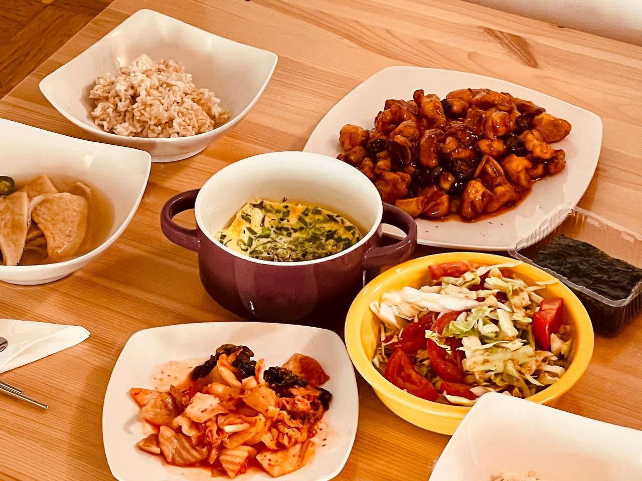 23/04/18 저녁_현미밥/어묵국/닭강정/계란찜/김치/김/토마토 양배추 샐러드