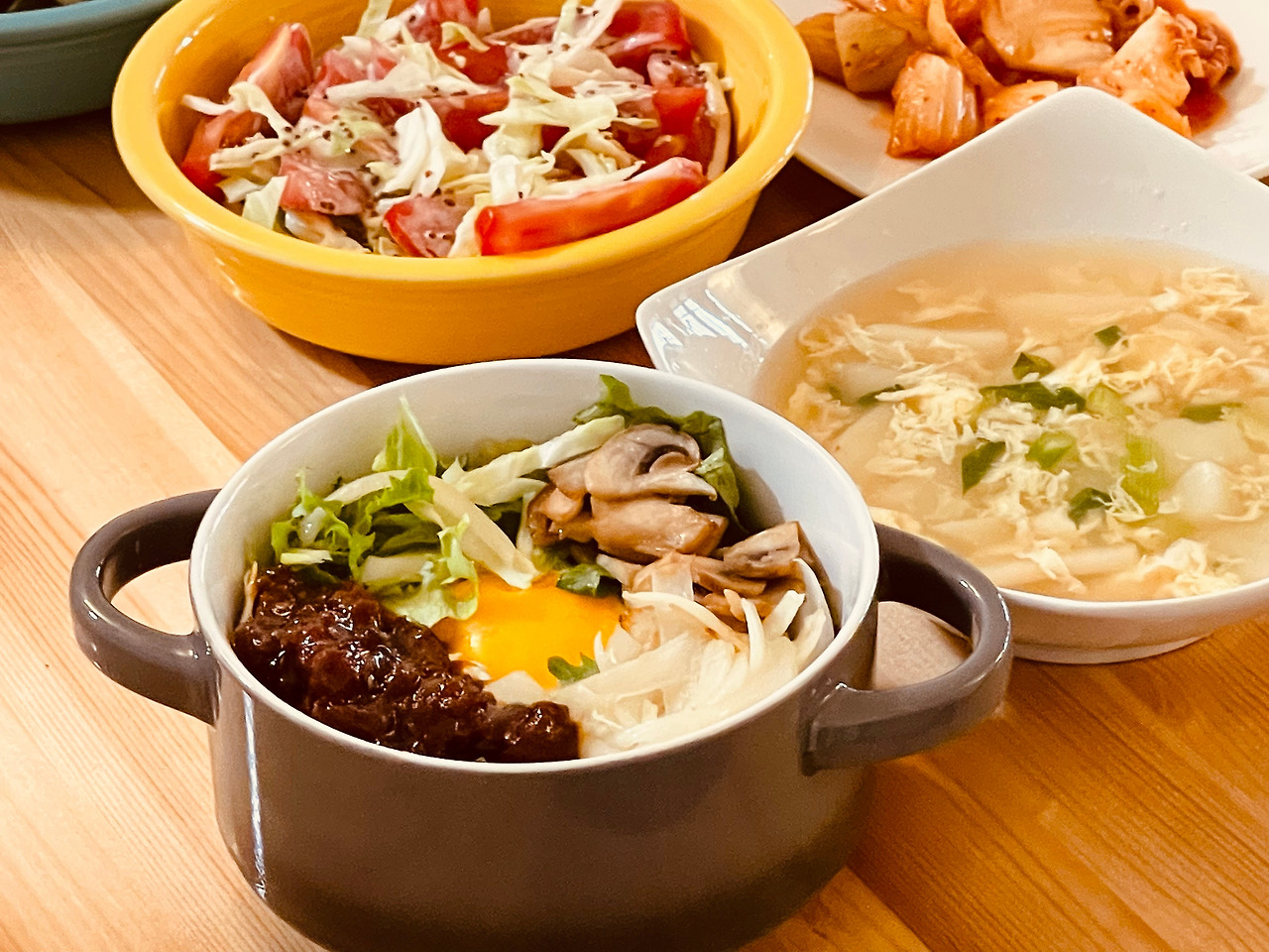 23/04/19 저녁식사_ 소고기 약고추장을 넣은 비빔밥/감자 계란국/미역무침/김치/양배추 토마토 샐러드