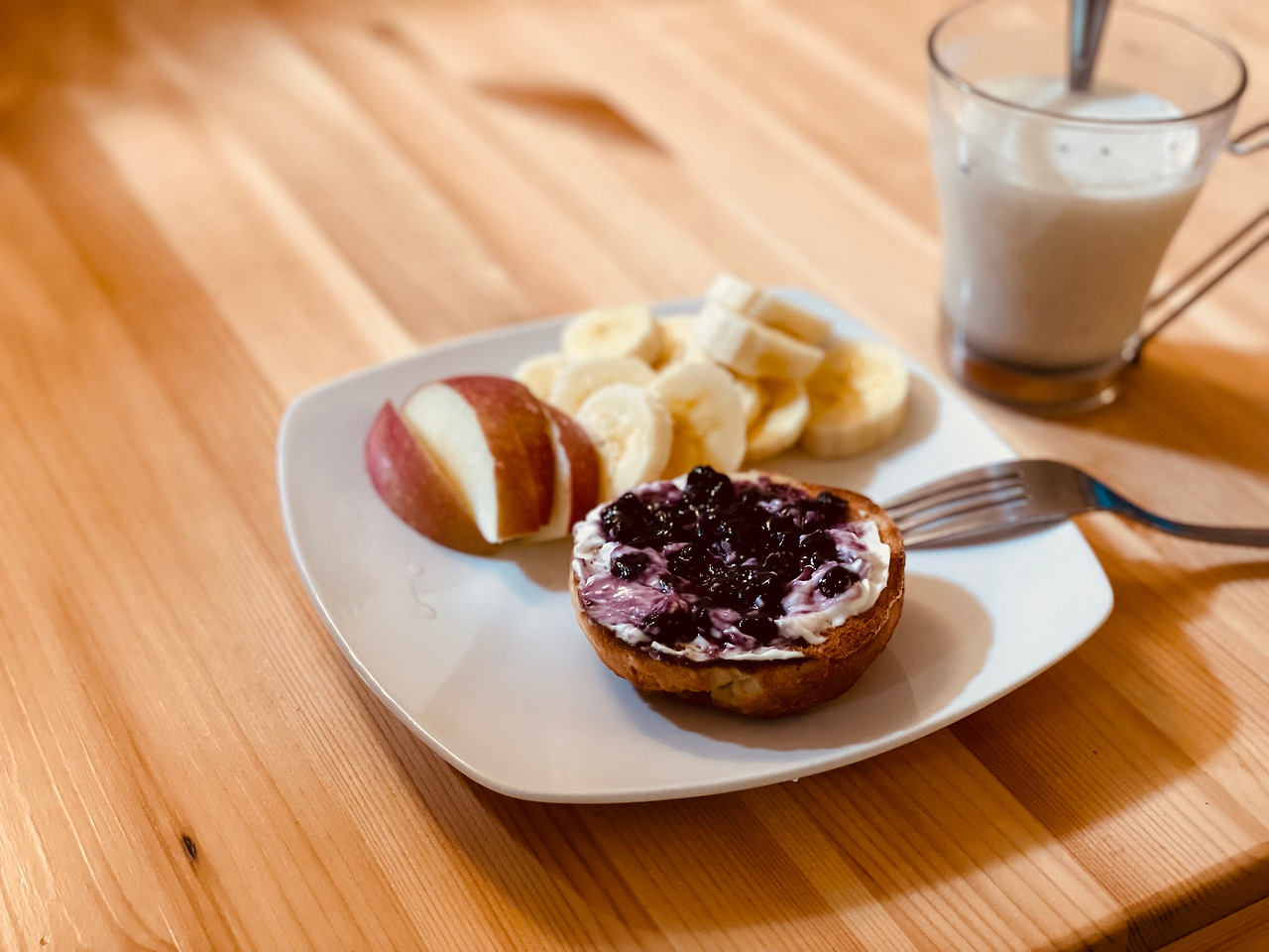 23/04/19 아침 식사_크림치즈와 블루베리잼을 바른 베이글, 바나나, 사과 그리고 검은콩가루와 꿀을 탄 우유