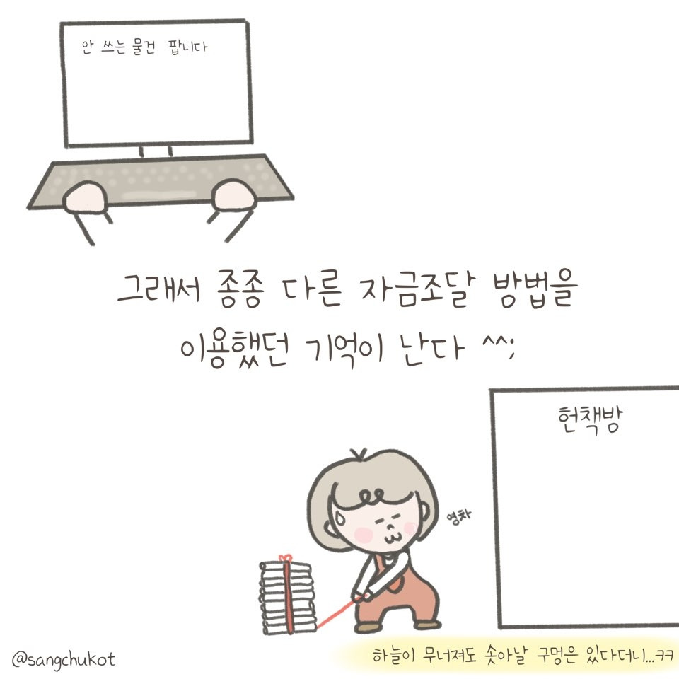 알바와 취준을 병행하기 힘들어서 알바를 관두고 한동안 엄마 카드를 사용했었는데 생활비 외에도 책이며, 인강이며, 독서실 이용료며 이것저것 돈 드는 것이 많아 늘 죄송스러웠다. 그래서 지하철 타고 다니며 보이던 지하상가의 옷들이 탐날 때 말은 못 하고 몰래 학교 중고거래 사이트랑 헌책방에 더 이상 안 보는 책을 팔아 자금을 마련하곤 했었다. 그땐 인터넷 중고서점에서 책을 판매하는 방법을 몰랐어서 헌책방에 직접 들고 찾아갔었는데, 한 권당 돈이 얼마 안 돼서 늘 여러 권씩 들고 가느라 애 좀 먹었던 기억이 난다.