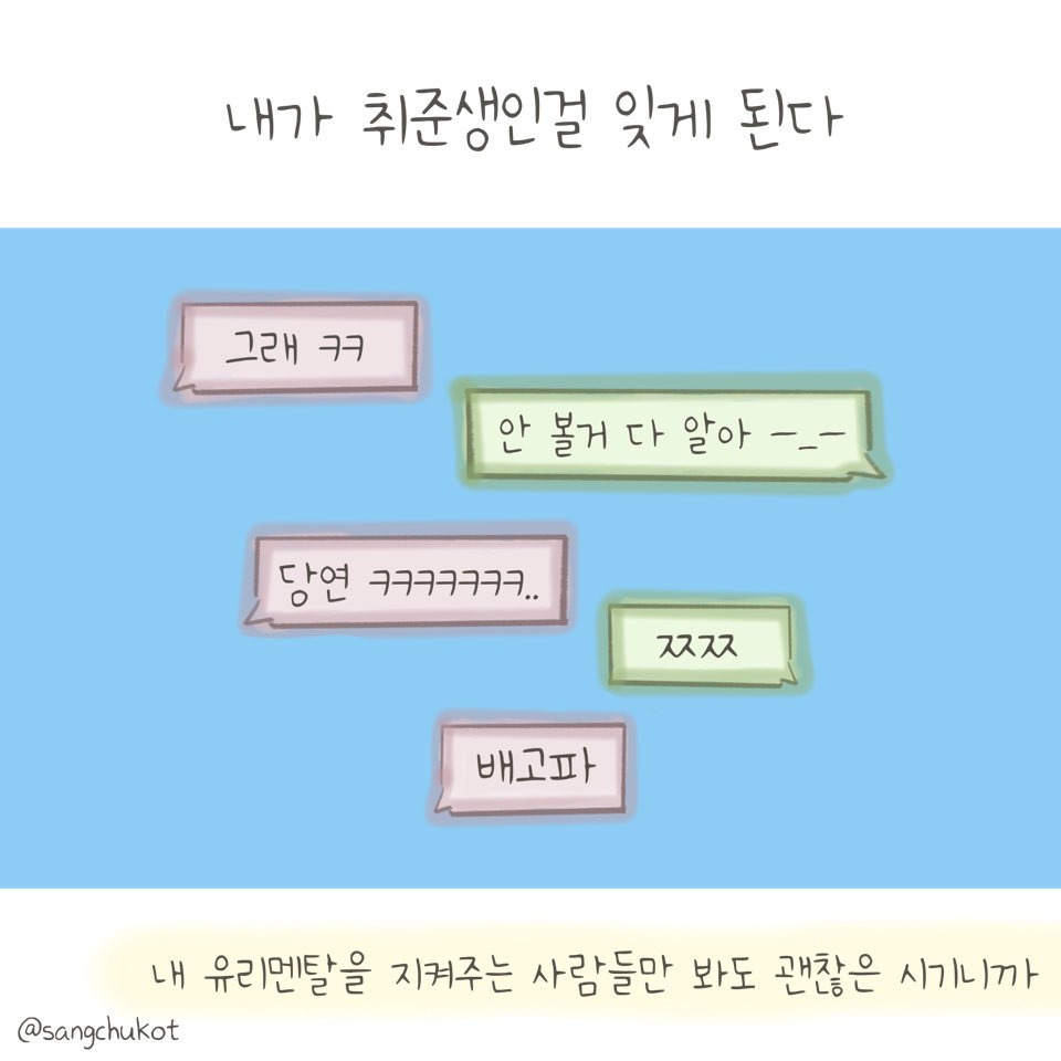 그리고 그 흐름을 끊어버린 친구도 생겼다. 원래부터 본인 내킬 때만 나를 찾고, 정작 내가 힘들 땐 상처 주는 말만 골라하는 아이였다. 마음의 여유가 있을 땐 그래도 얘를 어떻게 끊어내나 싶어 받아줬었지만 취준 때는 견딜 수가 없었다. 나에게 앞으로 나아갈 힘을 주는 사람들만 만나기에도 부족한 시기에 애꿎은 곳에 감정 쓰레기통을 자처하며 주저앉을 필요는 없다고 생각한다. 이는 멘탈관리를 위한 생존전략이다.