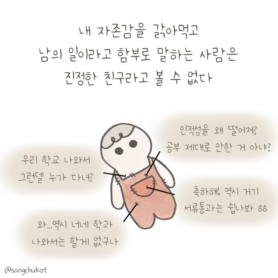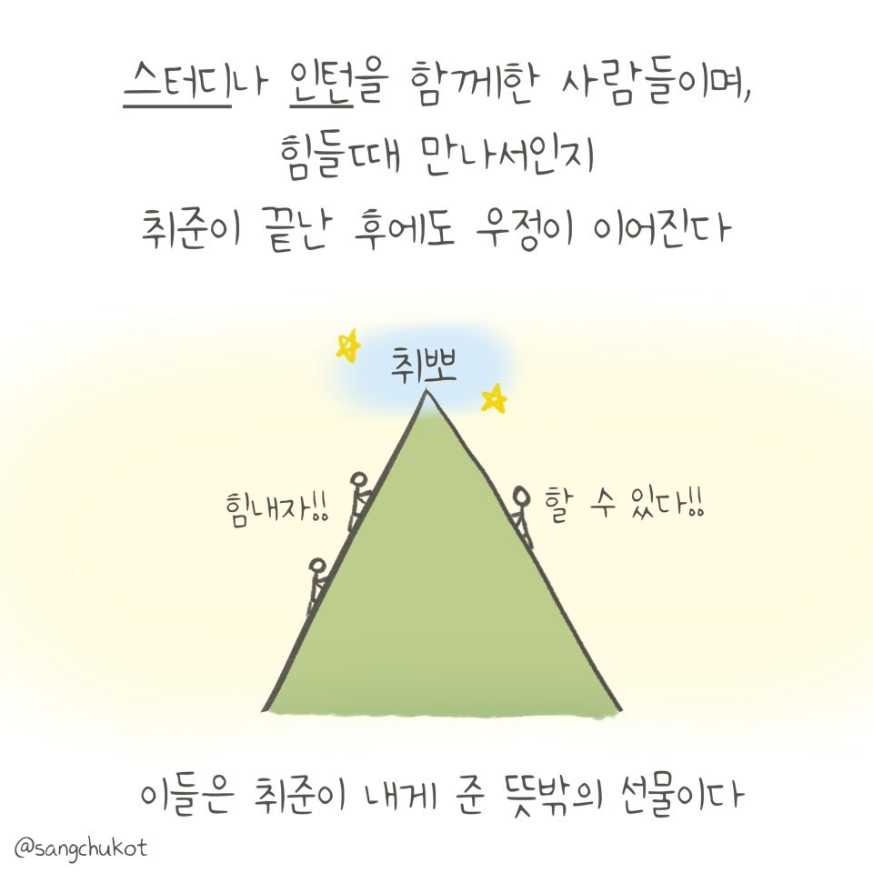 다른 길을 걷느라 서로에게 소홀해도 이해해주는 친구들도 좋은 우정이었고, 취업준비라는 동일한 경주속 경쟁자임과 동시에 가장 가까이서공감해주는 동반자 관계 또한 좋은 우정이었다. 또 아무 내용 없는 대화를 나눠도 마음이 편안해지는 관계 또한 당연히 좋은 우정이었다. 그렇게 힘을 빼고 자연스러운 흐름에 인간관계를 맡기게 되었다.