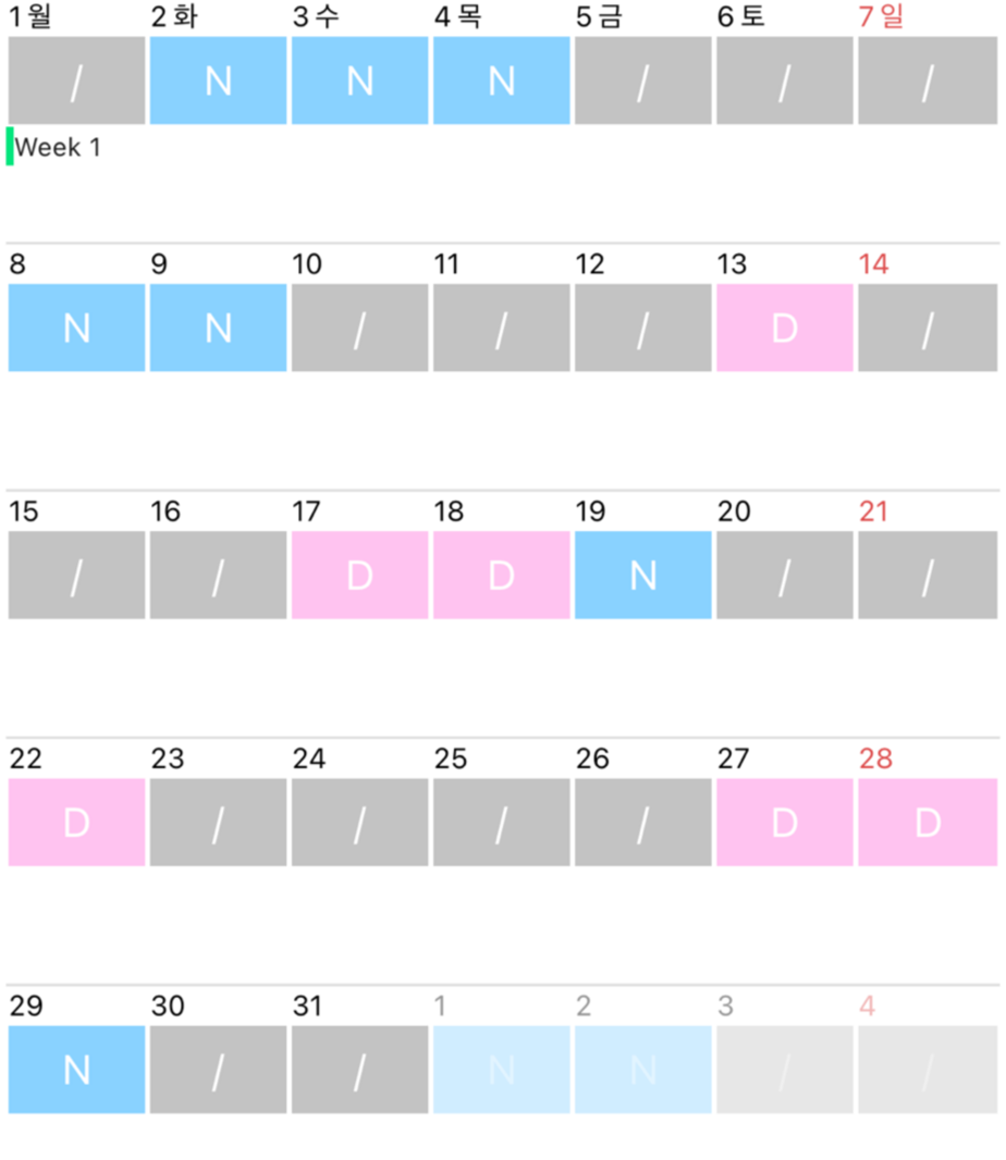 반면 유럽 현지로 넘어오고 나서는 자유롭게 근무를 신청하고, 종종 한 달치의 근무표를 원하는 대로 전부 신청하기도 한다. 내가 일하는 병원은 12시간씩 근무를 하는 2교대로 돌아가기 때문에 데이(오전 7시~오후 7시), 나이트(오후 7시~오전 7시)로만 이루어져 있다. 아래에는 유럽현지에서의 근무표이다. (D: 데이, N: 나이트, /:휴일)