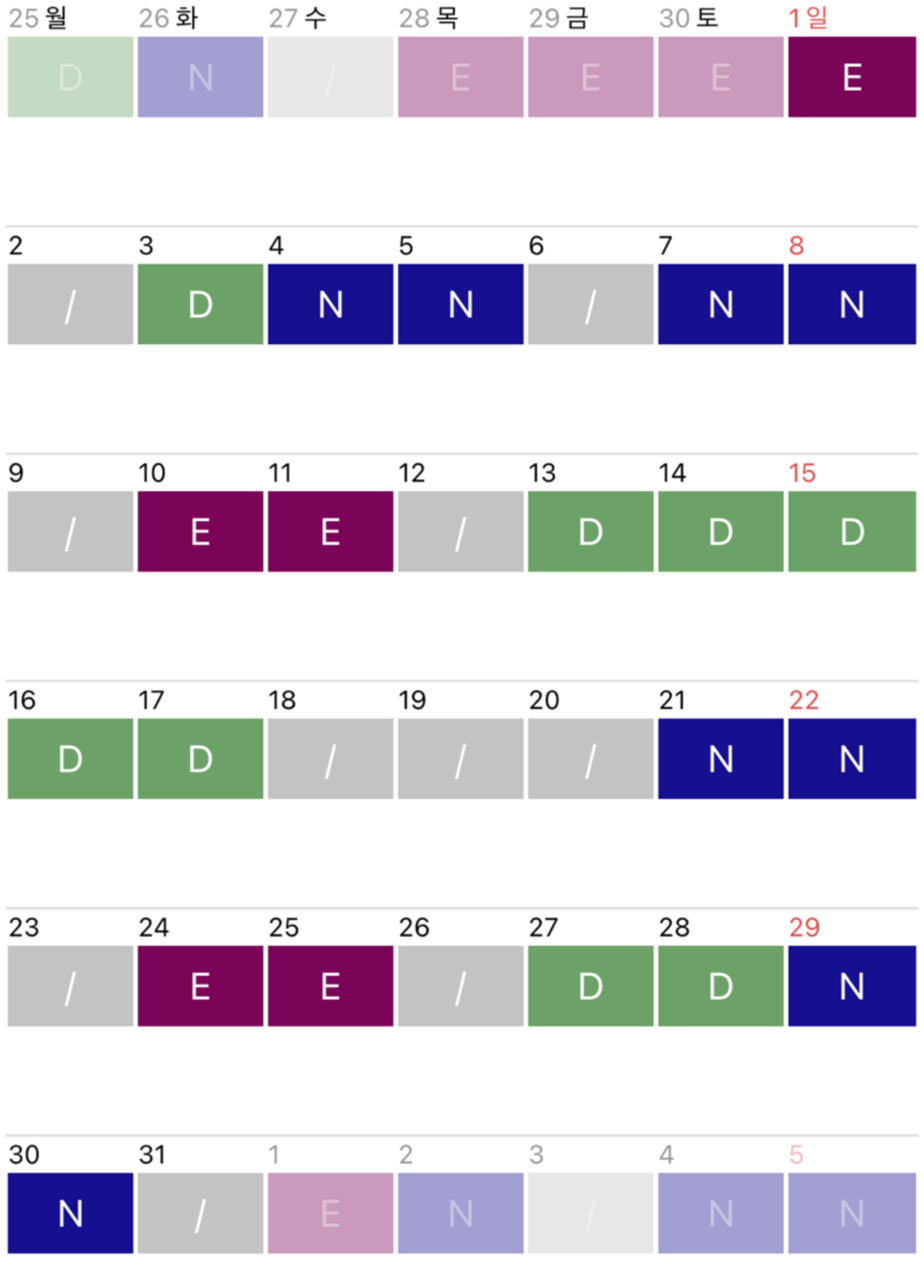 아래는 내가 한국에서 근무를 했던 달에 소화했던 근무표이다. (D: 데이, E: 이브닝, N: 나이트, /: 휴일)