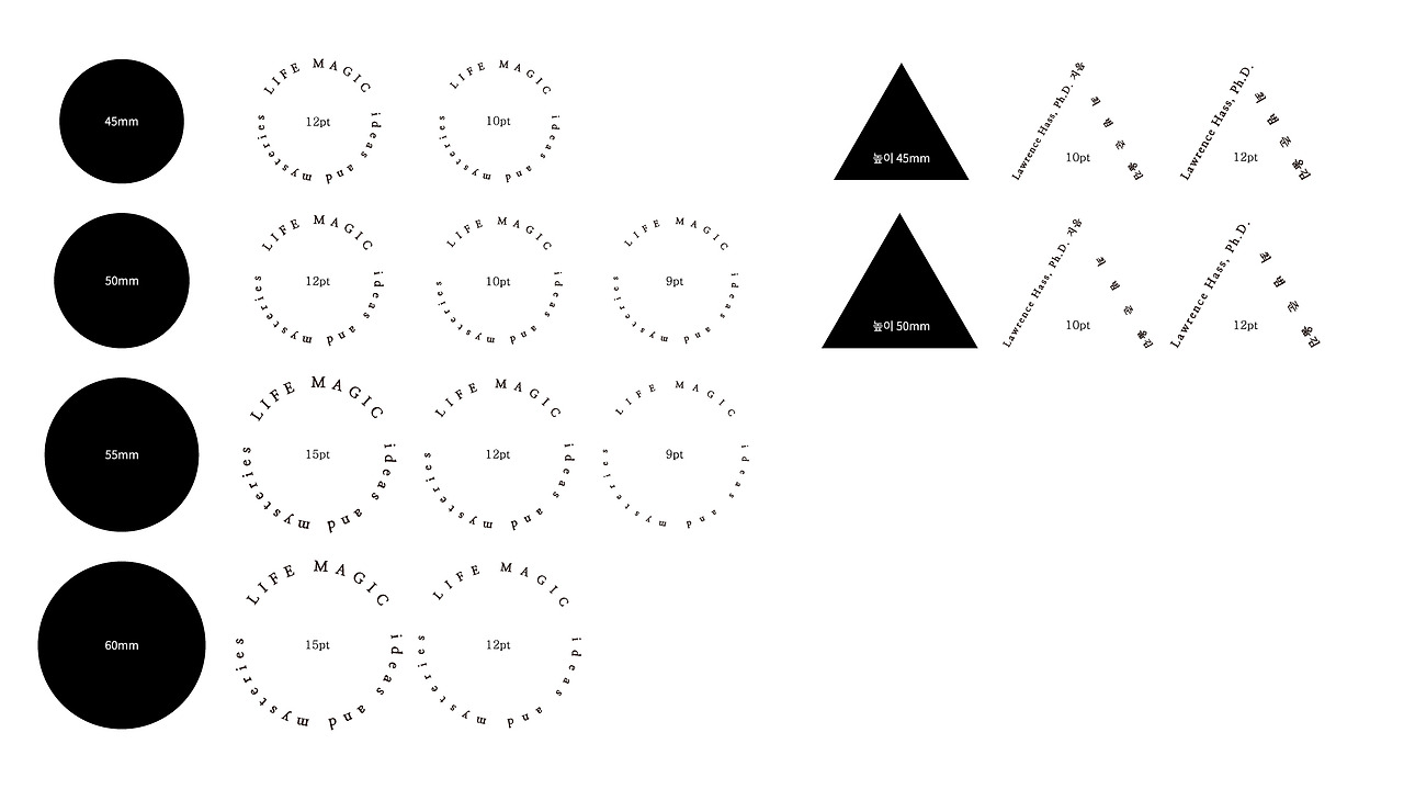 이 과정을 통해 가장 이상적인 글씨와 도형의 크기를 정한다. 원형에 들어가는 글씨는 12pt, 삼각형에 들어가는 글씨는 10pt로 정했다. 폰트의 경우 책 내용에 쓰인 폰트와 동일한 폰트를 사용했으며, 원에 들어가는 글씨는 책의 원제목이었기에 저자와 역자에 사용한 폰트보다 크게 사용했다. 도형의 크기는 원의 경우 지름 55mm, 삼각형의 경우는 높이 52.5mm를 사용했다.