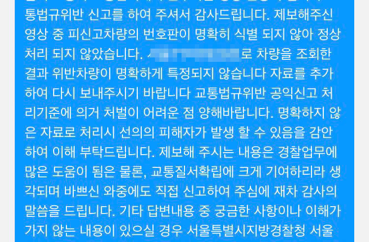 이 때문에 담당 경찰인 해당 지역 경찰서 교통과 손OO 경장은 “조회 결과 위반차량이 명확하게 특정되지 않”아서 처벌이 어렵다고 알려왔습니다.