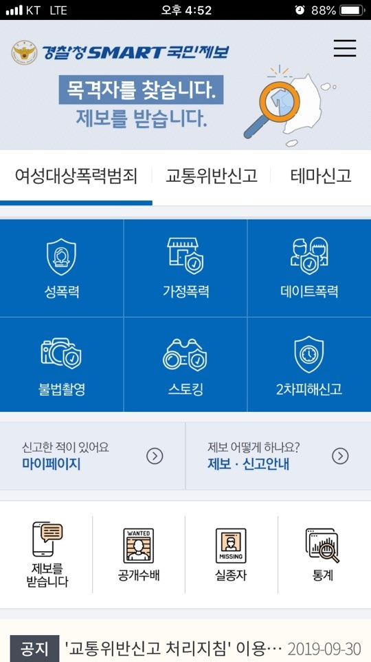 이 앱에서는 성폭력, 가정폭력, 데이트 폭력, 불법 촬영, 스토킹, 교통위반 등을 항목별로 신고할 수 있습니다.