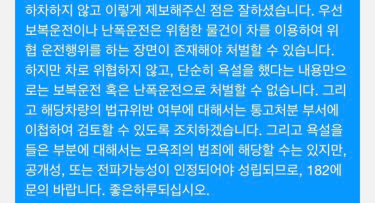 앞서 사건을 접수한 경찰서 교통범죄수사팀 김OO 수사관은 “하차하지 않고 제보해주신 점은 잘하셨습니다”라며 “욕설만으로 난폭운전으로 처벌할 수 없”다고 답변을 남겼습니다. 상대방으로부터 욕설을 들은 부분은 모욕죄에 해당할 수 있으나, 전파 가능성이 인정되어야 성립한다네요.