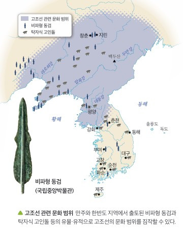 고조선의 중심지에 대해서도 갑론을박하지만, 지금의 랴오닝 지역과 평양 지역을 중심으로 발전한 것으로 보는 것이 일반적이다. 이 지역에서 비파형 동검과 탁자식 고인돌이 출토되기 때문인데, 이 유물이 고조선과 직접적으로 관련이 있는지는 알 수 없다. 다만 맥락적으로 추론할 뿐이다.