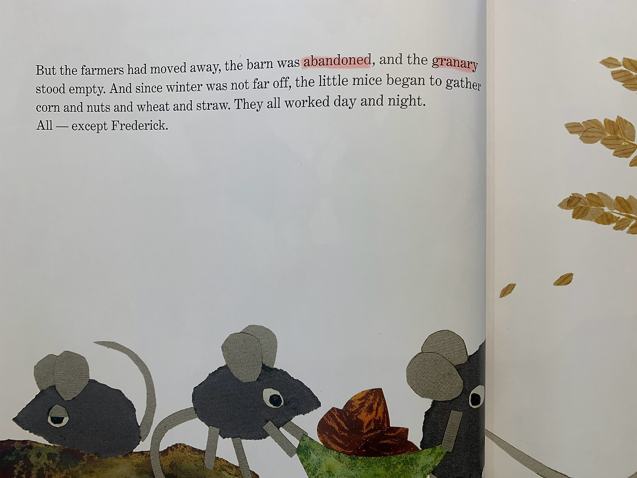 농부들이 다른 곳으로 이사를 가면서 먹을 것이 궁핍해진 생쥐가족은 열심히 겨울을 대비하여 음식을 저장한다. 그러나 프레드릭은 예외다. 모두가 창고를 채우고 있을 때 프레드릭은 다른 준비를 했다.