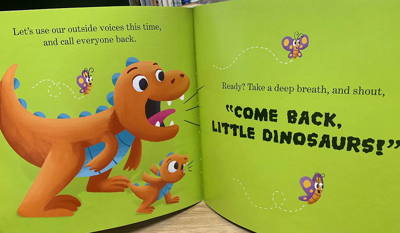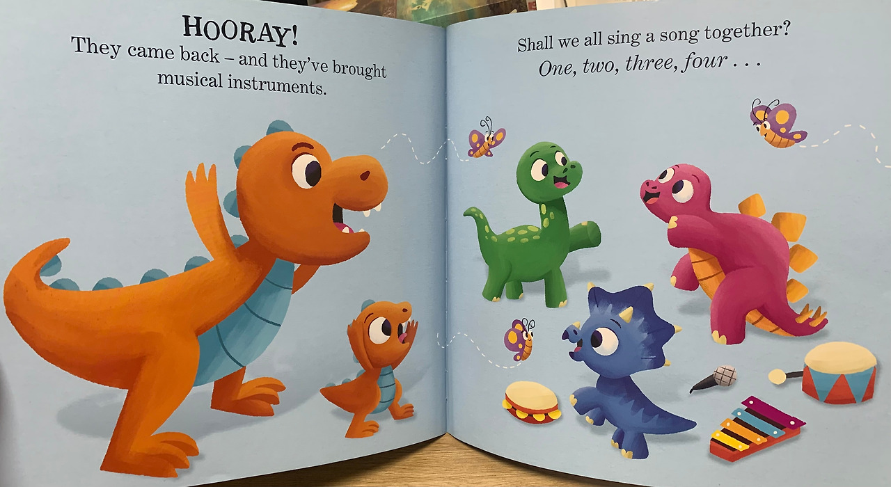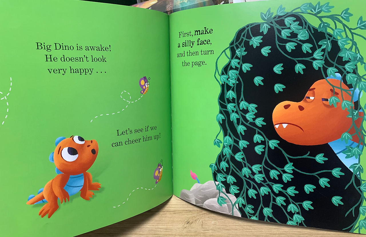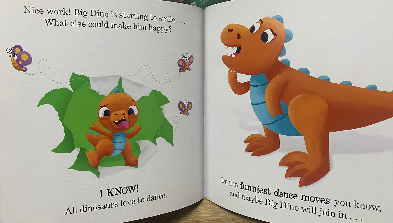 조용조용해야 했는데 결국 Little Dino가 Big Dino를 깨워버린다. 친구들은 다 무서워 도망가버리고 아기 공룡이 혼자 엄마인지 아빠인지 모르겠는 어른 공룡에게 재밌는 표정을 지으며 웃게 해 주는데..