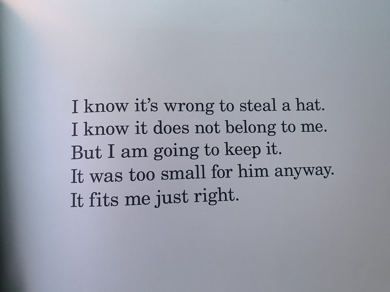 표지만 봤을 때에는 작은 물고기에게 찰떡인 모자. 사실 그 모자의 주인공은 따로 있었다. 아마 자기가 훔친 사실을 모를 거고, 자기가 어디로 도망치는지 주변에선 아무도 말을 안 해줄 거라 생각하지만. 결국 마지막에 가선 다 들통이 난다.
