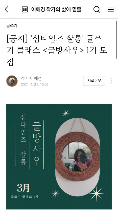 그러다 시온님이 '매일 기록하는 사람들'이란 이름으로 꾸준히 주중 글쓰기를 할 수 있는 도전을 던져주셨고, 저도 4기로 함께하게 되었어요. 블로그를 시작했으니 글도 열심히 써보자 했는데..! 왜 이렇게 즐거운가요!! 아이를 밤에 재우고 나올 힘이 생기고, 새벽 3시까지 글을 쓰고 자도 피곤하지가 않고, 생명력이!! 자존감이 팍팍 올라가는 거예요!@.@ 이렇게 글쓰기에 불꽃이 튀고 있을 때, 이애경 작가님의 글쓰기 수업 모집 글을 보게 됩니다:D