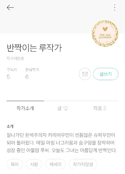 브런치도 인스타처럼 처음엔 낯설어 손을 못 대고 있다가, 지난달 말에 제가 코로나를 걸리며 격리됐던 4박 5일의 소중한 시간 동안!! 브런치 작가명도 '반짝이는 루작가'로 수정하고:) 작가소개도 다시 수정하여 브런치에 글을 쓰고 있습니다^^
