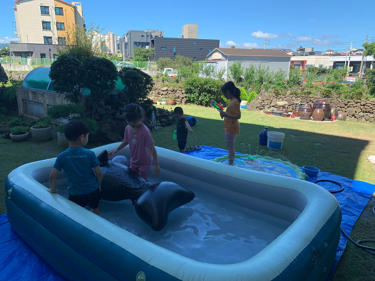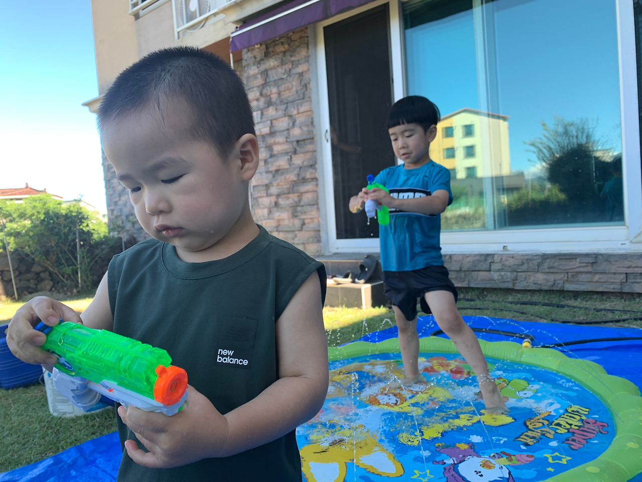 어제는 친하게 지내는 성당언니의 초대를 받았다. 하루 전날은 우래기들 온다고 '에어바운스 빌려뒀어~~~~'하는 문자를 보내더니, 오늘은 새벽부터 '물 받는 중이야~~ 얼른 와~~~~~'하는 메시지를 보낸다. (이모사랑 나라사랑!) 물총을 챙기고 설레는 마음으로 우리 셋은 언니 집으로 등원했다.