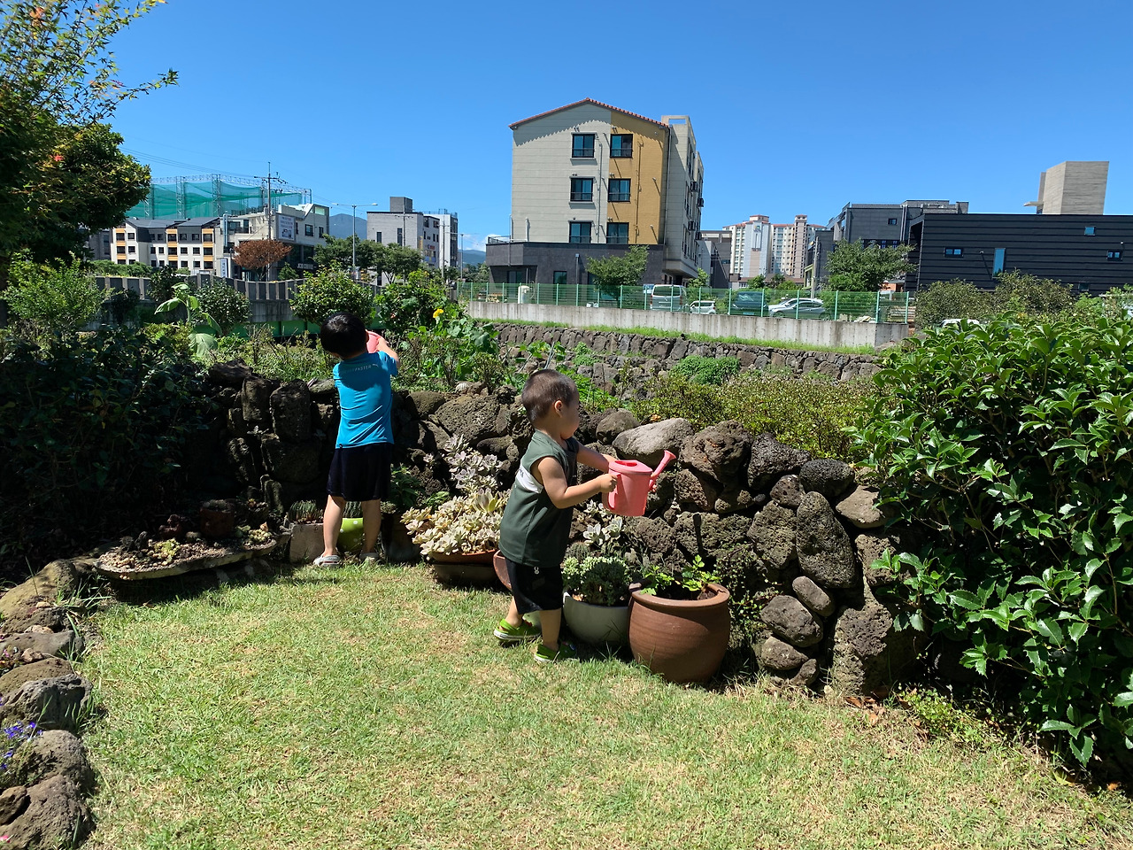 햇빛이 더 들어오기 전에 그늘에서 신나게 물놀이를 하고 몸도 말릴 겸, 받았던 물은 주변 꽃과 나무들에게 나누었다. 누나들이 물뿌리개에 물을 담아주면 열심히 여기저기를 뛰어다니며 물주는 우리 사랑꾼들♡