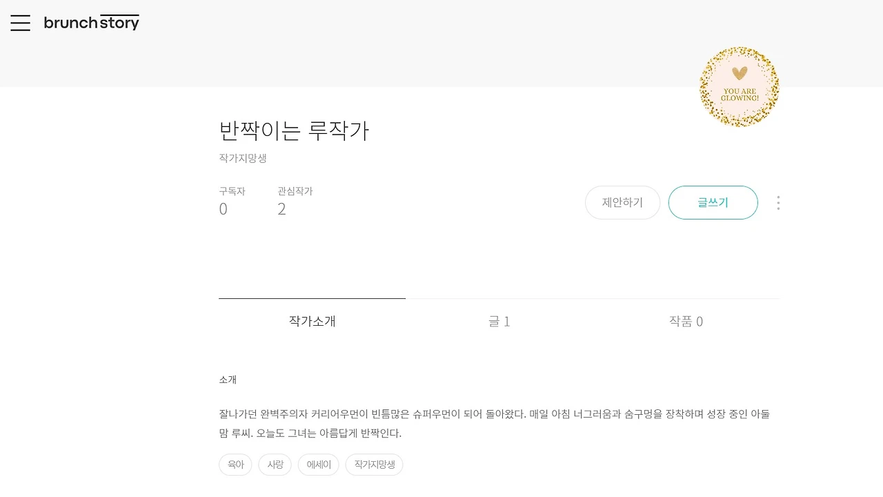 그리고 다른 하나는 브런치 스토리 시작 세팅이었다. 일단 브런치 작가가 되긴 했는데 그 이후에 한 번도 들어가지 못했던 낯선 그 곳. 마음은 이미 매거진도 카테고리별로 나누고 연재글도 올리는데 행동이 따라주지 못했다. 이젠 발을 담고 물을 적셔나갈 때다 싶어 작가명도 '반짝이는 루작가'로 바꾸고 작가 소개도 다시 바꾸었다.