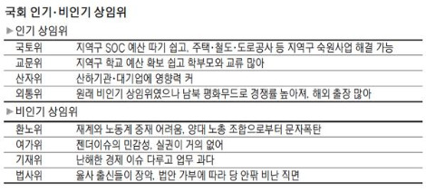 법률안의 경우 구체적으로는 정부나 국회의원의 발의->소관 상임위원회 회부 및 합의안 도출->법제사법위원회 자구수정->국회 본회의 표결 후 공포 절차를 거친다. 이 가운데 소관 상임위원회 논의가 가장 실질적이고 중요하다. 상임위는 의원들의 희망을 받긴 하지만, 해당 분야에 대한 전문적 지식과 정당 내에서의 짬, 경륜 등을 종합적으로 고려하여 원내대표가 배치를 결정한다. 의원들의 최대목표가 '재선'인 만큼, 권한이 많아 지역구 민원해소가 용이한 국토위, 교문위, 예결위 등이 인기가 많은 반면 실권이 약하고 지역구 접촉이 제한된 상임위는 초선의원들이 배치되는 경우가 많다.
