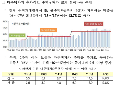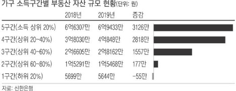 문제는, 한국 자산시장이 서울 중심의 부동산 시장으로 일극화되어 있다는 점이다. 앞서 말한 자산불평등이 제한된 주택공급 때문에 더욱 빠르고 심하게 전개될 수 있다는 뜻이다. 지난 10년간 상위 1%의 1인당 주택 보유 수는 2007년 3.2채에서 2017년 6.7채로 약 2배 증가했다. 다주택자의 비중이 늘어나면서 무주택 전·월세 가구 비중은 2005년 37.1%에서 2017년 44.1%로 늘어났다. 주택보유가 집중된 상황에서 부동산 가격 상승은 무주택자들의 소득을 다주택자에게로 이전하는 효과를 낳는다. 주택 보유격차가 소득격차로 이어지는 불평등의 연쇄작용이 발생해 왔던 것이다. (참고: 경향신문, "포용성장 위해 부동산 연착륙 필요")