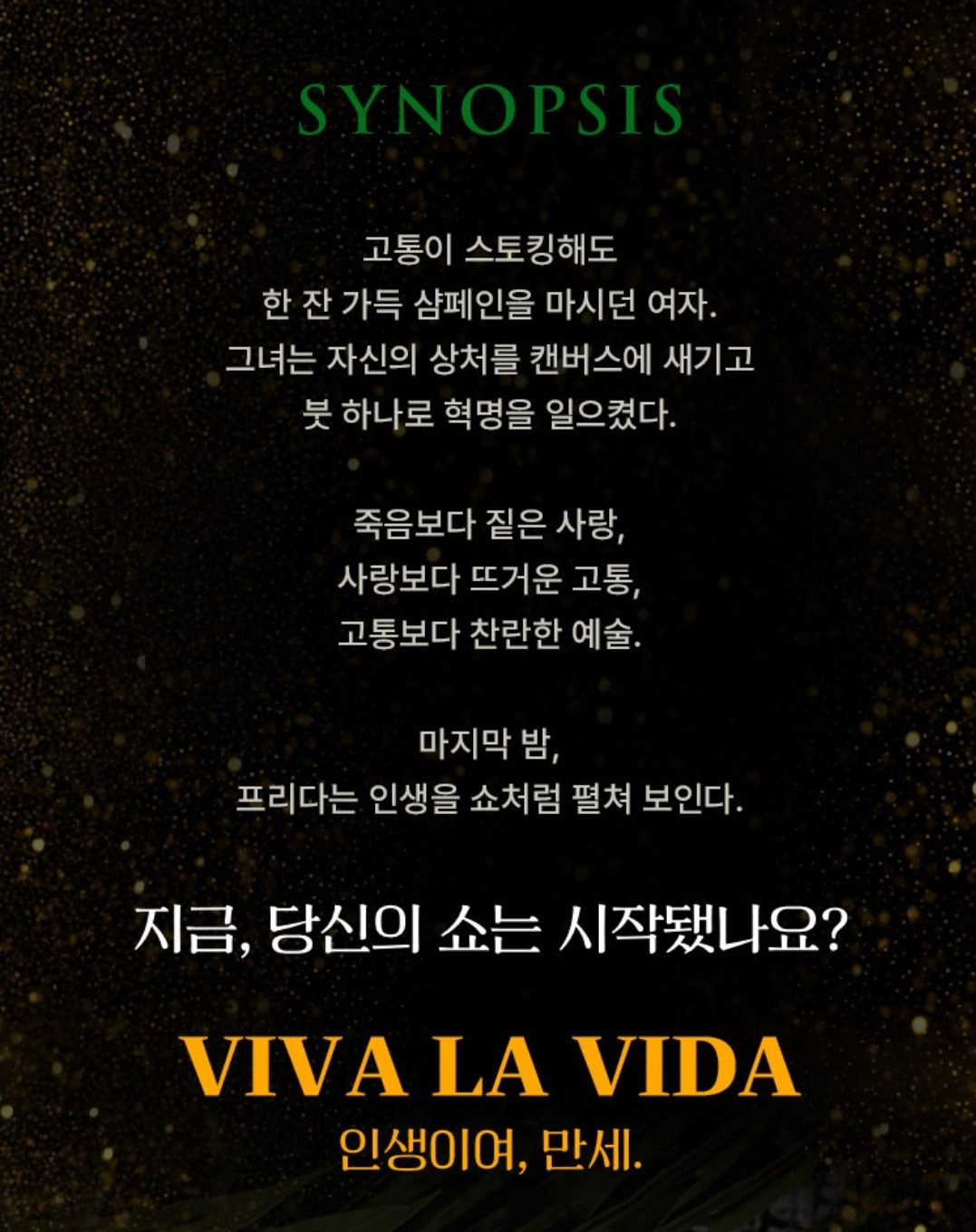 뮤지컬 <프리다>는 2020년 제 14회 대구 국제 뮤지컬 페스티벌에서 처음 선보여진 작품입니다. 멕시코의 화가이자 혁명가인 프리다 칼로의 삶을 녹여낸 뮤지컬로 시놉시스는 아래와 같습니다.