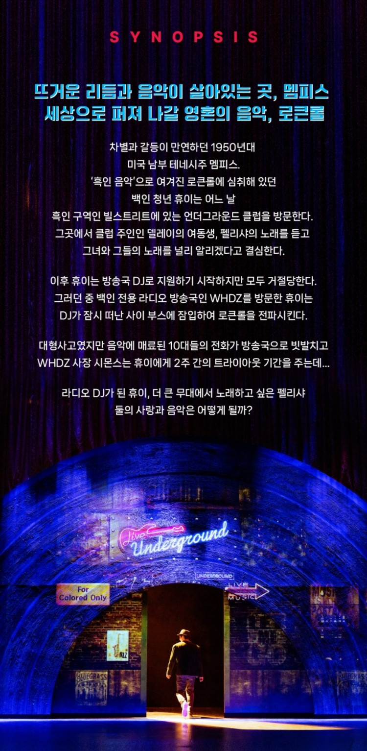 뮤지컬 <멤피스>는 2002년 미국에서 초연된 뮤지컬입니다. 과거 미국 멤피스에 실존했던 DJ 듀이 필립스의 실화를 바탕으로 만들어졌다고 합니다. 멤피스는 2023년에 한국에서 초연되었는데 2025년 6월부터 충무아트센터 대극장에서 재연되고 있습니다. 시놉시스는 아래와 같습니다.