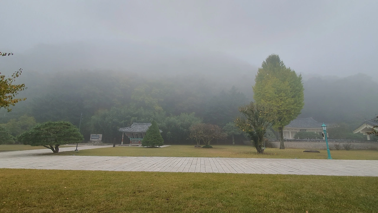 인적 없이 안개 가득한 충익사 뜰에 서서