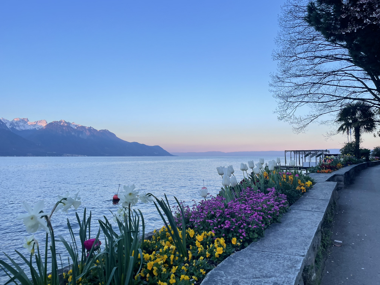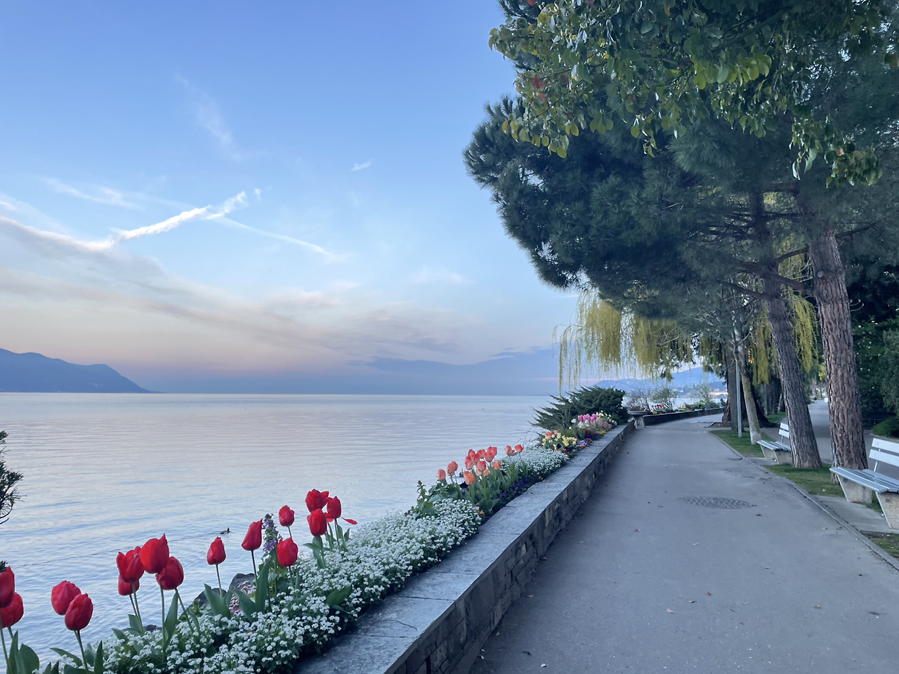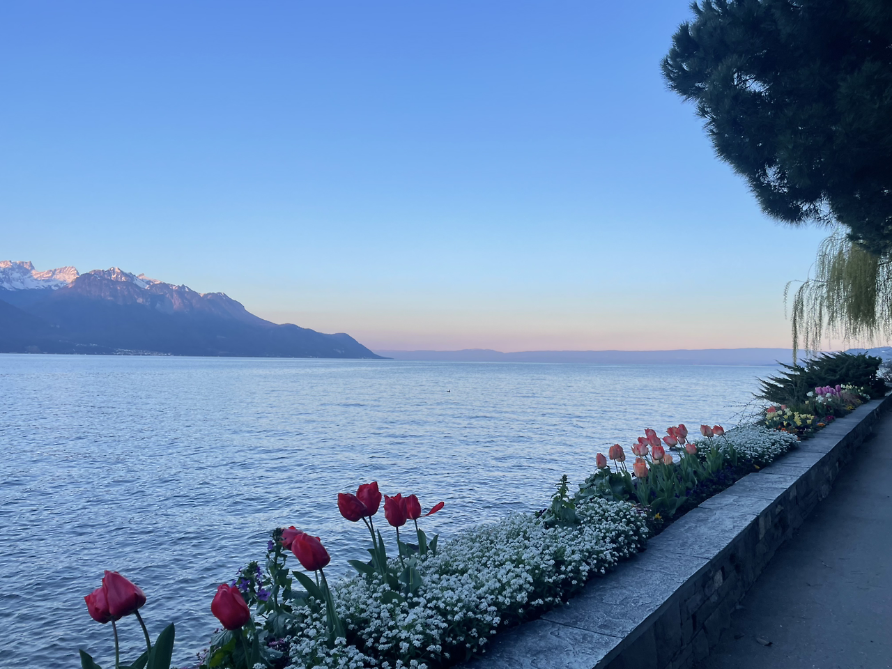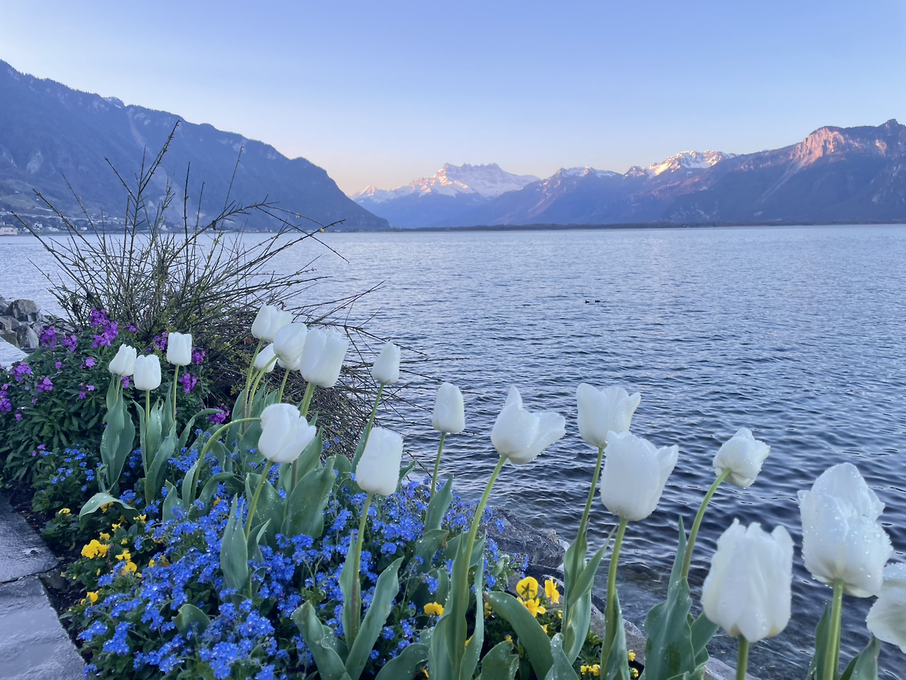 숙소가 레만 호숫가 바로 앞이고, 호텔에서 호숫가 산책로로 바로 나갈 수도 있어서 아침 점심 저녁 틈 날 때마다 산책을 나갔다. 똑같은 길이지만, 아침에는 차가운 아침 공기와 함께 스프링쿨러 물을 맞은 청초한 꽃들의 상쾌함, 동이 터오면서 만년설 쌓인 산이 분홍색으로 물드는 모습을 볼 수 있었고, 낮에는 한낮의 태양에 필터 씌운 것 마냥 투명한 하늘 (미세먼지 없는 유럽의 하늘 ㅠㅠ 말모..)과 역시 필터 씌운 듯 색감 쨍한 튤립을 구경하고, 저녁에는 구름 한 점 없는 하늘의 손톱같은 그믐달과 빛이 거의 없어 꽤나 많이 박혀 있는 별들을 보았다.