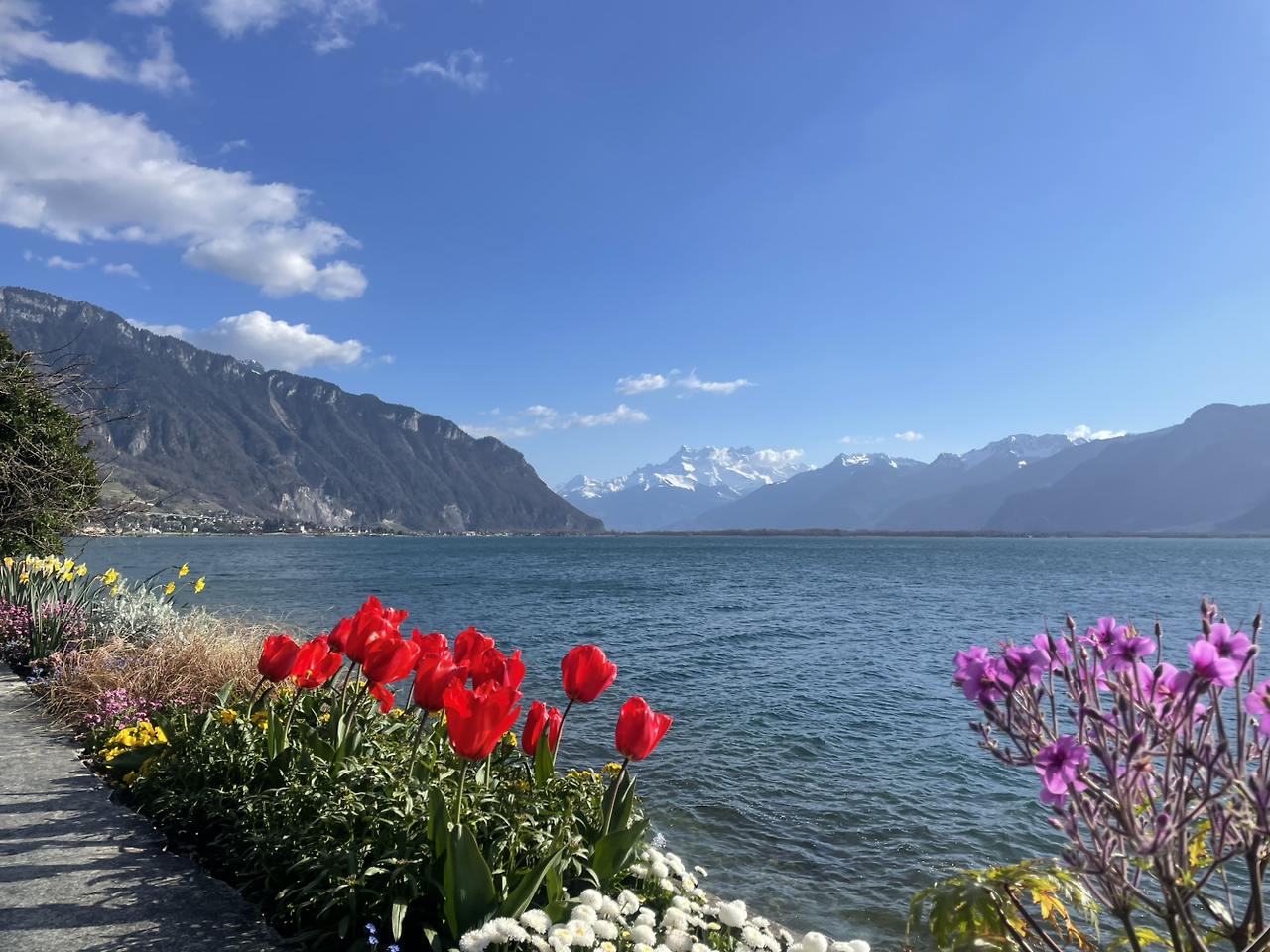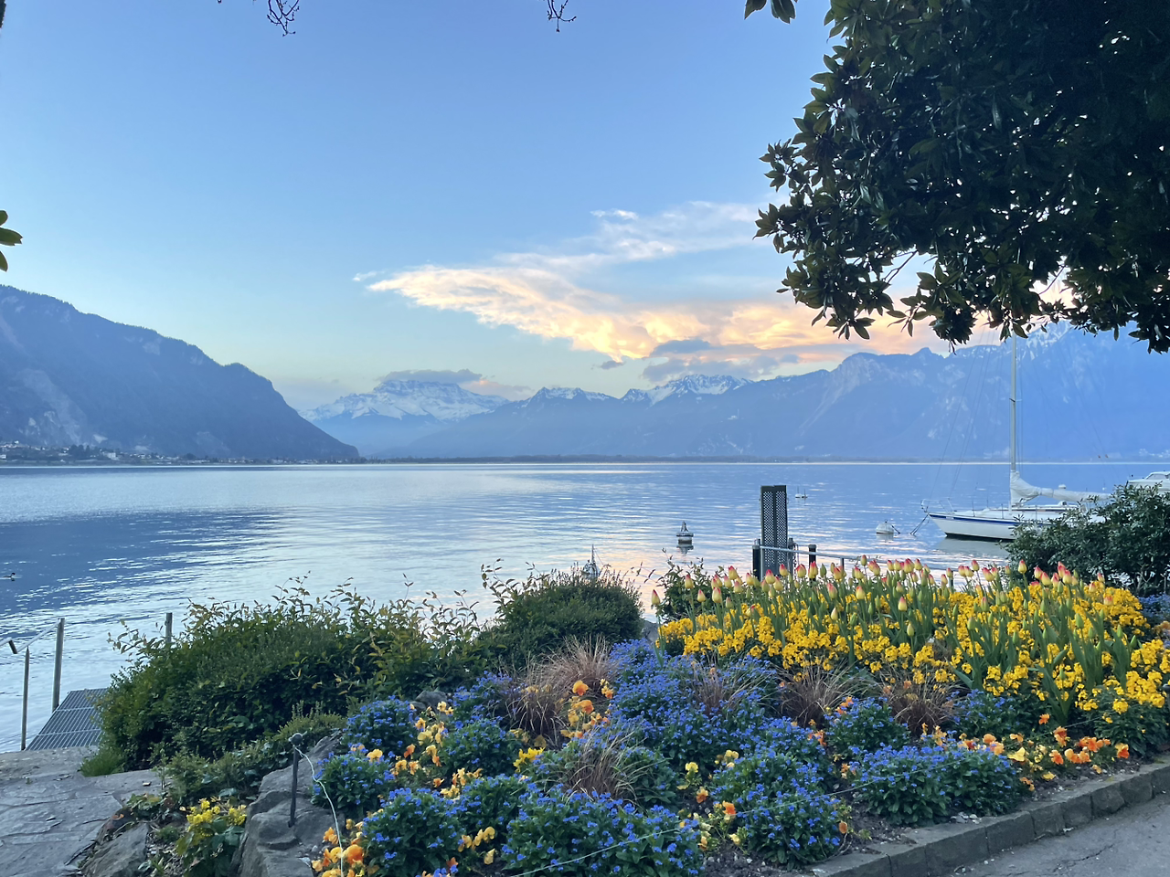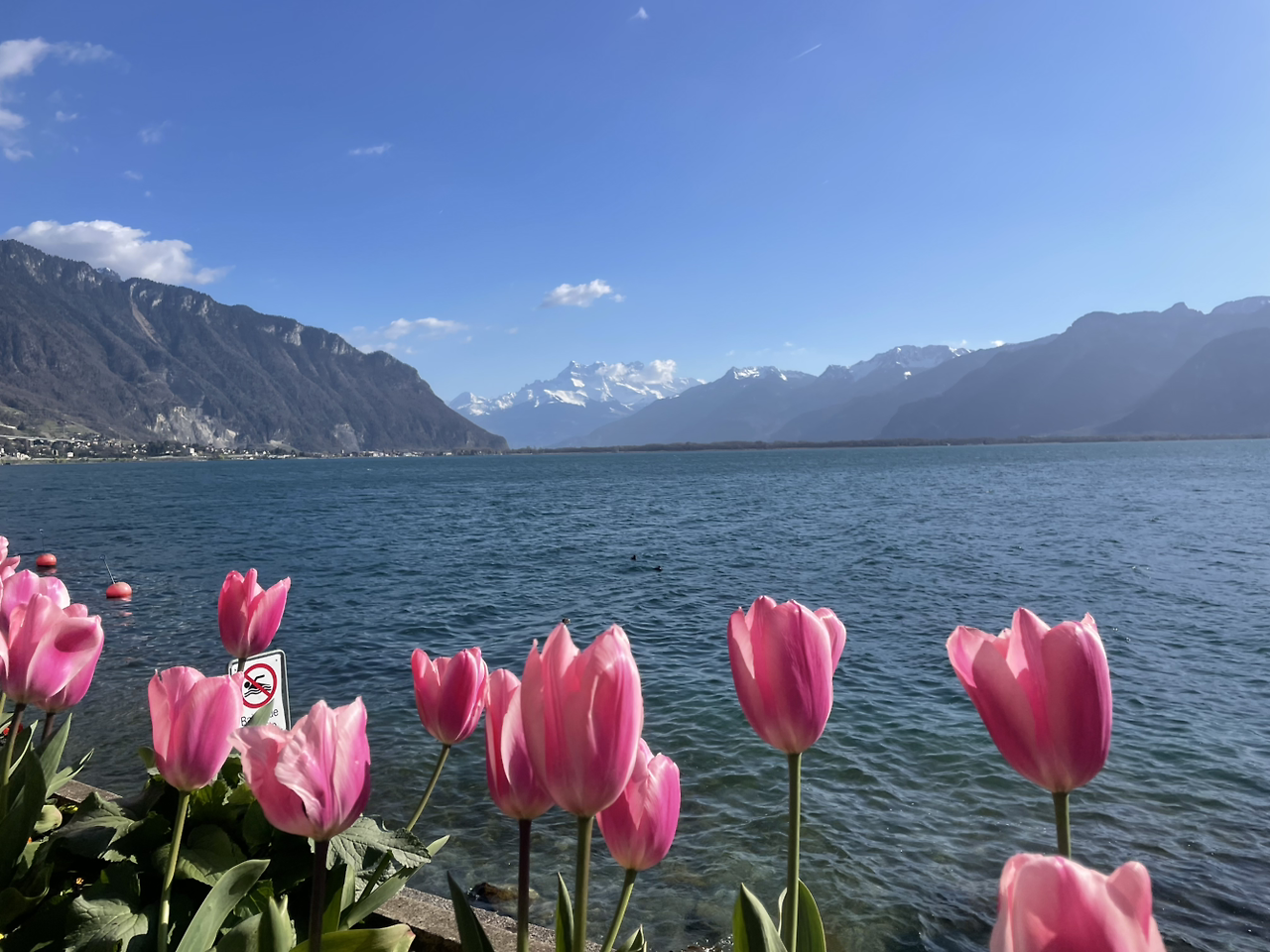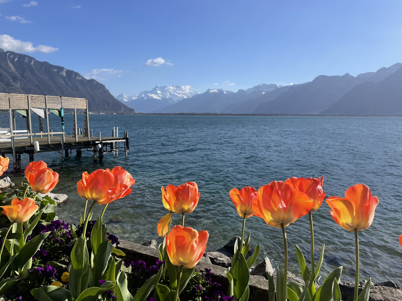 숙소가 레만 호숫가 바로 앞이고, 호텔에서 호숫가 산책로로 바로 나갈 수도 있어서 아침 점심 저녁 틈 날 때마다 산책을 나갔다. 똑같은 길이지만, 아침에는 차가운 아침 공기와 함께 스프링쿨러 물을 맞은 청초한 꽃들의 상쾌함, 동이 터오면서 만년설 쌓인 산이 분홍색으로 물드는 모습을 볼 수 있었고, 낮에는 한낮의 태양에 필터 씌운 것 마냥 투명한 하늘 (미세먼지 없는 유럽의 하늘 ㅠㅠ 말모..)과 역시 필터 씌운 듯 색감 쨍한 튤립을 구경하고, 저녁에는 구름 한 점 없는 하늘의 손톱같은 그믐달과 빛이 거의 없어 꽤나 많이 박혀 있는 별들을 보았다.