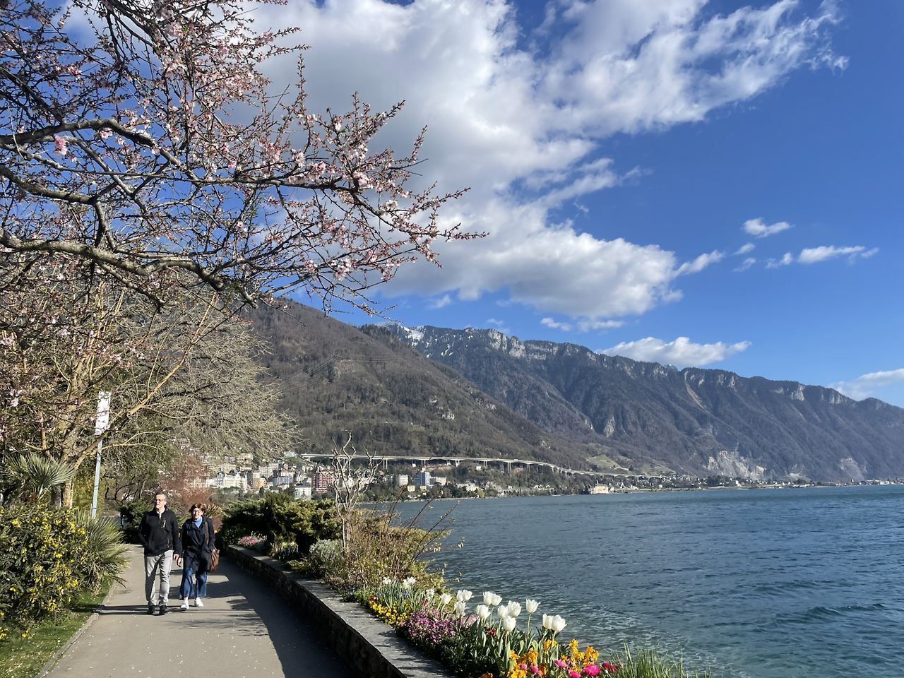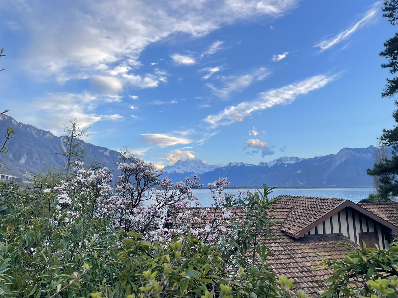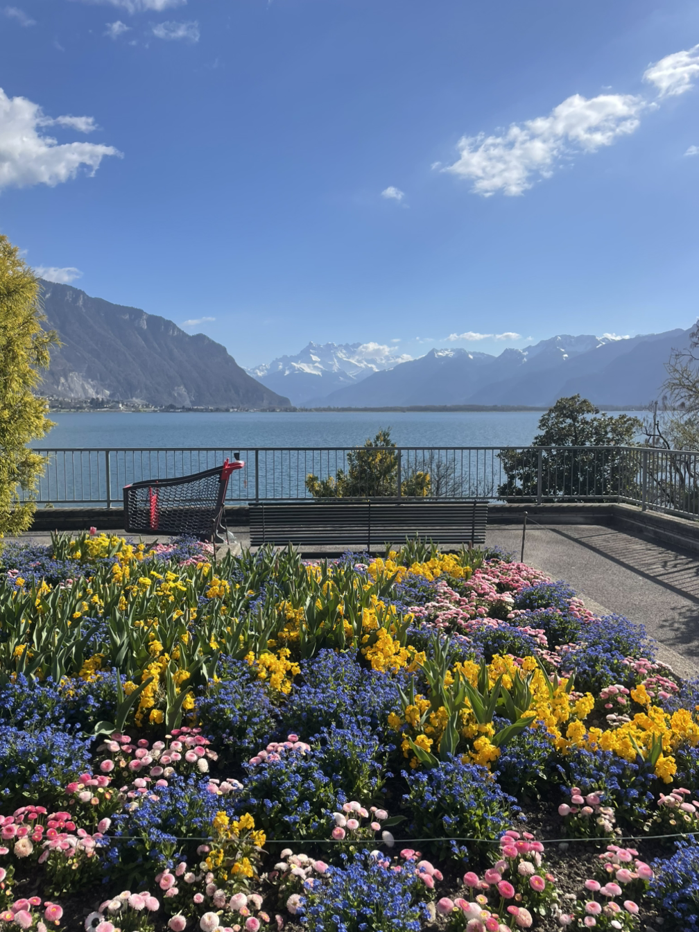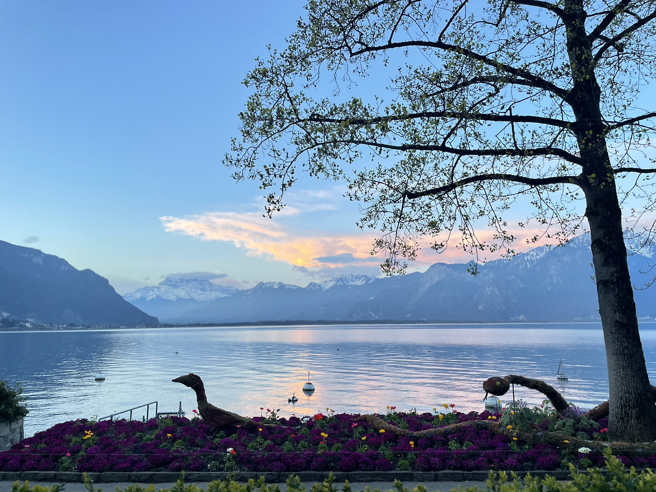 숙소가 레만 호숫가 바로 앞이고, 호텔에서 호숫가 산책로로 바로 나갈 수도 있어서 아침 점심 저녁 틈 날 때마다 산책을 나갔다. 똑같은 길이지만, 아침에는 차가운 아침 공기와 함께 스프링쿨러 물을 맞은 청초한 꽃들의 상쾌함, 동이 터오면서 만년설 쌓인 산이 분홍색으로 물드는 모습을 볼 수 있었고, 낮에는 한낮의 태양에 필터 씌운 것 마냥 투명한 하늘 (미세먼지 없는 유럽의 하늘 ㅠㅠ 말모..)과 역시 필터 씌운 듯 색감 쨍한 튤립을 구경하고, 저녁에는 구름 한 점 없는 하늘의 손톱같은 그믐달과 빛이 거의 없어 꽤나 많이 박혀 있는 별들을 보았다.