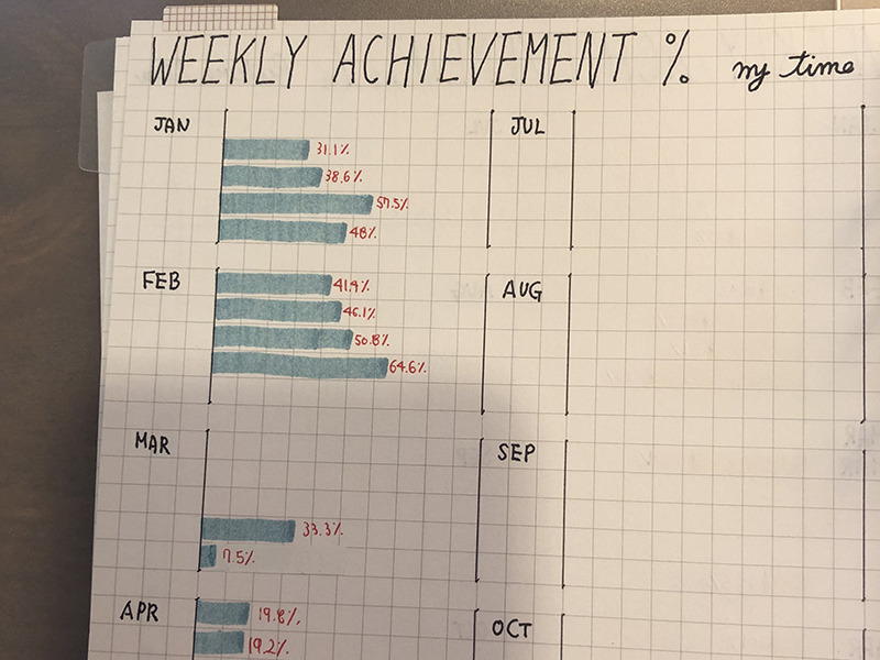 그래서 나는 실행력을 늘리기 위해 올해 다이어리에 '성취율 페이지'를 만들었다. 매일매일 할 것들을 '미래를 위해 해야만 하는 것', '나를 위한 개인적인 것들'로 나누어 리스트로 작성하고, 투두 리스트 체크하듯이 그 날 계획한 할 일들 중 한 것들을 체크한다. 그리고 그 체크한 것들을 매일 퍼센트로 환산하고, 다시 주 단위로 평균을 내어 '성취율 페이지'에 기록한다.