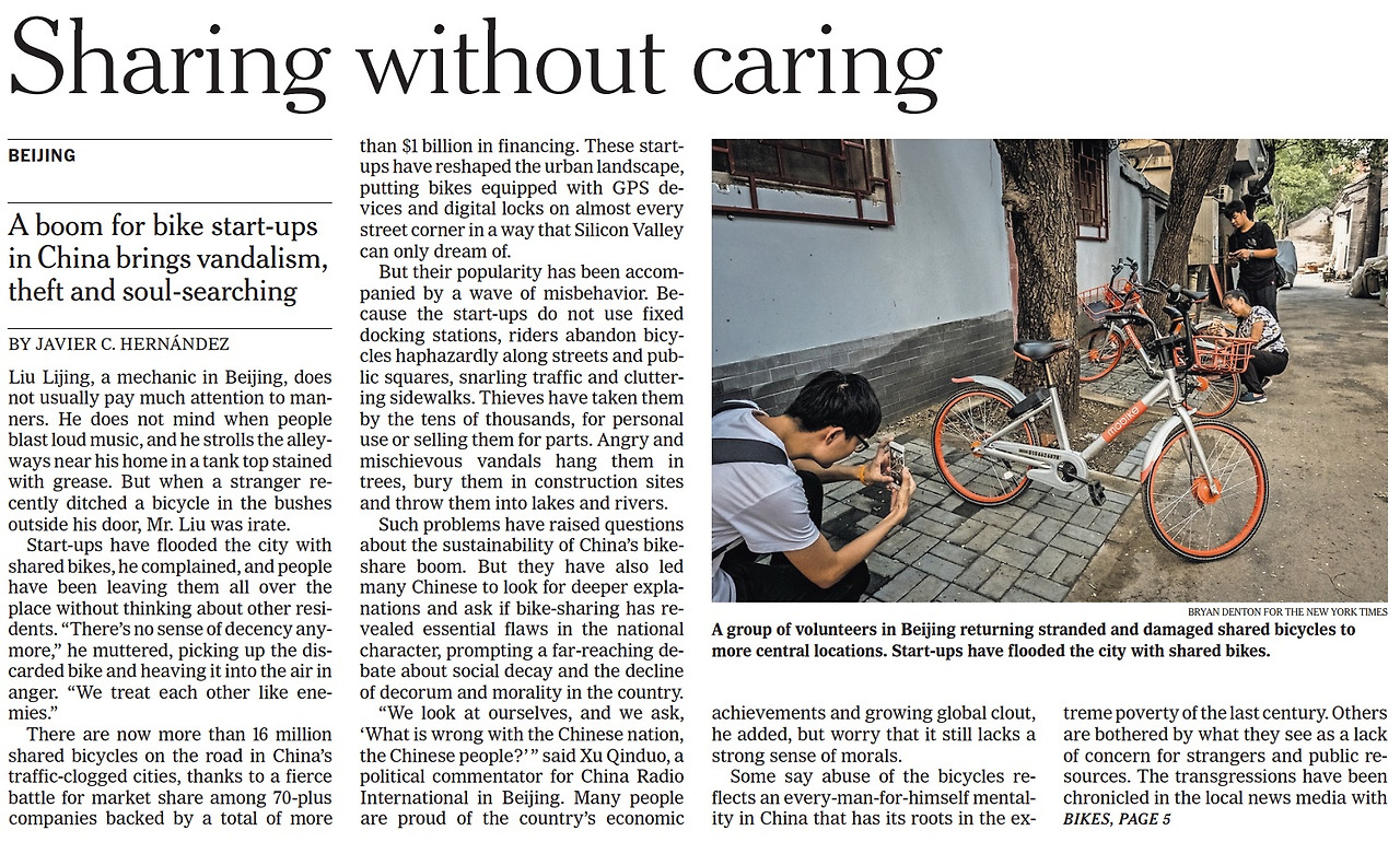 지난해 여름 상하이를 방문했을 때 내가 직접 체감했던 공유자전거 열풍은 실로 대단했다. 역시 대륙 스케일답게 모바이크의 오렌지색 자전거가 도시를 점령하고 있어 어디서든 손쉽게 빌려 탈 수 있었다. 모바이크는 정거장이 따로 없다. 특정 장소에 반납할 필요 없이 길거리 아무 데나 정차해 두고 가면 되는데, 이게 장점이자 단점이다. 이런 비거점형 공유자전거의 문제는 뉴욕타임스(NYT)에서도 지적했듯 유지 및 관리에 있다. 차도나 횡단보도 같은 곳에 방치되는 경우가 허다하고, 도난되거나 개인이 사유화하며 문제가 되고 있는 것이다. 중국 충칭의 공유자전거 서비스 우콩(悟空单车)은 자전거에 GPS를 부착하지 않고 이용자의 양심에 맡긴 결과, 자전거의 90%를 도난당해 결국 지난해 6월 파산했다.