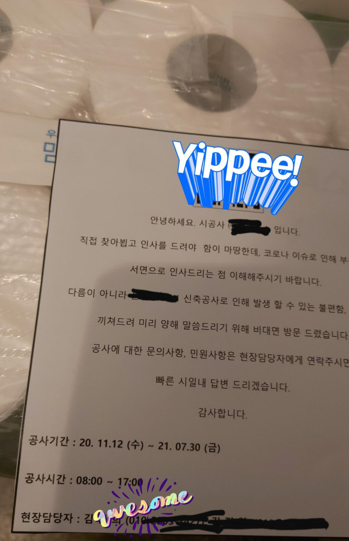 예고가 없었던 건 아니다. 지난주 어느 날 퇴근하고 돌아왔더니 두루마리 휴지 16개가 들어있는 큰 꾸러미가 우리집 출입문 앞에 놓여있었다. 신기한 건 같은 건물 같은 층 옆집 문 앞에도 같은 선물이 놓여있었다. 이게 뭐지 자세히 보니, 쪽지가 붙어있었다. "내년 7월까지 00건물 공사 예정이오니 소음 발생 양해 바랍니다."