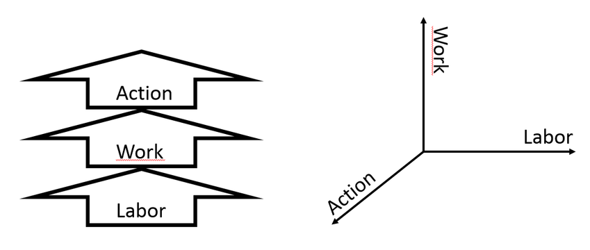 예컨대 한나아렌트는 ‘노동’을 조금 다른 시각으로 조망한다. <인간의 조건>에 의하면, 한나아렌트는 인간의 삶을 구성하는 활동을 ‘노동(Labor)’, ‘작업(Work)’, ‘행위(Action)’로 구분했다. ’노동‘은 인간이 생명을 유지하기 위해 반복적으로 수행해야 하는 활동이다. ’작업‘은 보다 영속적인 세계를 만드는 활동을 의미한다. 도구, 기술, 예술품, 제도 등을 만들며 자연을 넘어서 인간만의 세계를 구성한다. 노동보다 높은 차원의 활동으로 인간 존재의 창조적 능력을 보여준다. 마지막으로 ’행위‘는 다른 사람들과 함께 사회, 정치적으로 상호작용하면서 자신의 정체성과 자유를 드러내는 행위로, 인간만이 할 수 있는 고유한 궁극의 활동이다. 이는 개인의 고유함을 세상에 드러내는 방식이며, 한나아렌트에게 가장 고귀하고 인간다운 활동이다. 한나 아렌트에게 노동은 인간의 자유를 실현하기보다는 생존의 굴레에 종속시키는 낮은 차원의 활동이다.