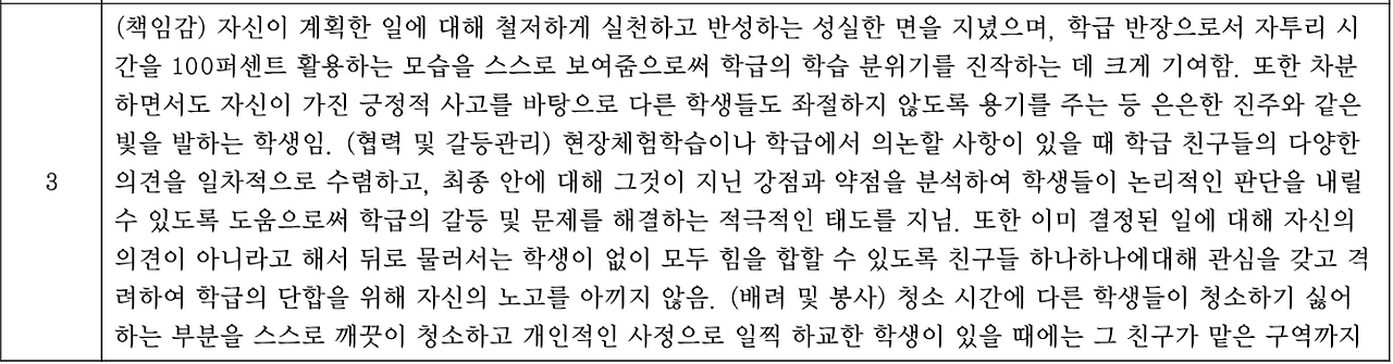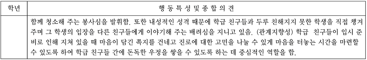 '차분하면서도 자신이 가진 긍정적 사고를 바탕으로 다른 학생들도 좌절하지 않도록 용기를 주는 은은한 진주와 같은 빛을 발하는 학생임.'