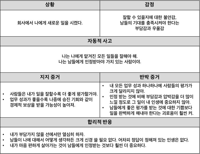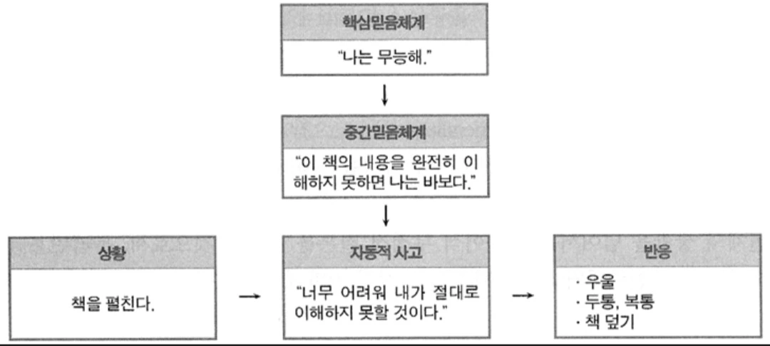 위 예시를 적용하면, 보통은 책을 펼친 다음 바로 우울해지는 것 같지만 사실은 우울해지는 이유는 책을 펼친 상황 때문이 아니라 책을 펼치면서 내가 갖고 있던 자동적 사고("나는 무능하니까 책의 내용을 이해하지 못할거야") 때문이라는 것이 발견되었다. 자동적 사고는 말 그대로 스쳐지나가는 생각이라 평소에는 의식하기 어렵지만 자동적 사고가 부정적이게 되면 심리적인 문제를 초래할 수 있어서 이를 제대로 인식하고 바로잡는 것이 중요하다고 했다.